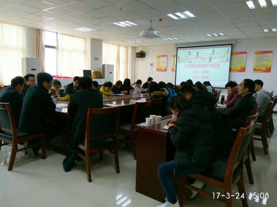 2017年3月24日,第二场博士论坛于下午三点在文综楼1130会议室举行。博士论坛是由许昌学院政治哲学研究所与马克思主义学院共同主办的常规性学术活动。本次论坛的报告题目是《规制与超越:实用理性的自我扬弃之路》,主讲人是郭现军博士,主评人是寇鸿顺博士、巴文泽博士。全校师生40多人参加了此次活动。