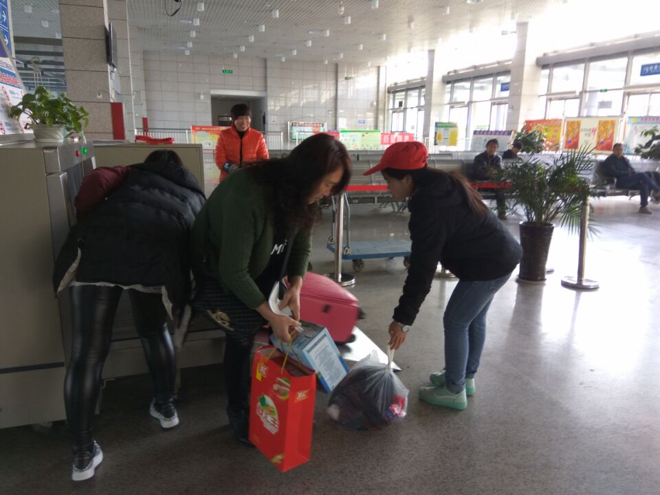 早晨七点,所有志愿者已在国旗台下集合完毕,整装待发。带队的两名干事反复强调了活动过程中应该注意的事项,志愿者们点头会意后,他们便伴着和煦的阳光出发了。到达目的地后,志愿者两人一组分别站在入站口、安检处、休息厅,出站口等进行志愿服活动。随着客流量的增加,志愿者忙得不亦乐乎。在入站口,志愿者接过乘客繁重的行李,并指引他们到购票处;在安检处,志愿者提醒来往的乘客过安检,维持乘客拿行李的秩序;休息厅,志愿者热心帮助乘客暂时照看行李,减少了乘客的困扰;在出站口,志愿者帮助乘客把行李送到公交车站,帮助他们选择正确的交通路线。