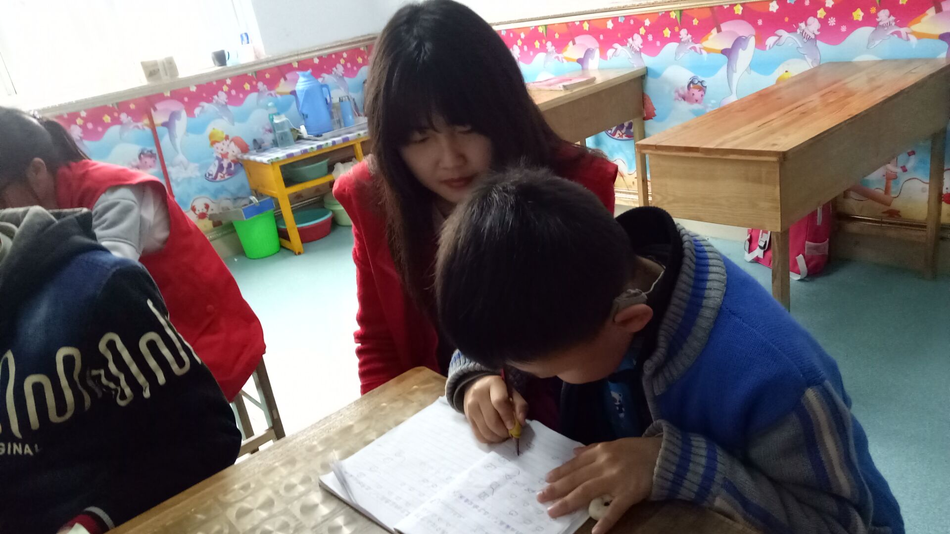 下午一点半,志愿者们就已集合完毕。到达康复中心后,活动负责人向志愿者们强调志愿服务活动中的注意事项,之后便两人一组的开始了志愿服务活动。刚推开教室的大门,小不点们便一窝蜂的围了上来,他们有的环着志愿者的腰身,撒娇似的嘟起小嘴,奶声奶气地叫着“哥哥姐姐”;有的握着志愿者的衣角,可怜巴巴地说着自己不会做的题目;有的抓着志愿者的双手,拉着志愿者去看自己的手工作品……志愿者们被这些可爱的小不点们征服了,微笑着一一答应他们的请求。
