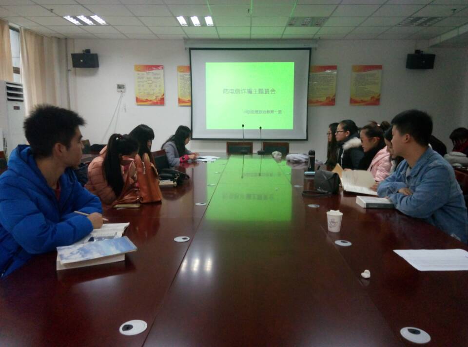 12月13日,我院15思想政治教育一班于我院会议室(文科综合楼1130室)进行了“防电信诈骗”主题班会。班会由辅导员王欣欣主持,并取得圆满成功。