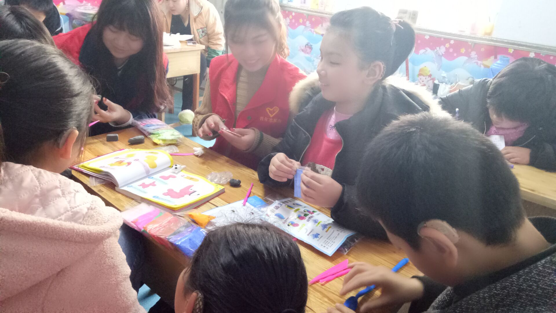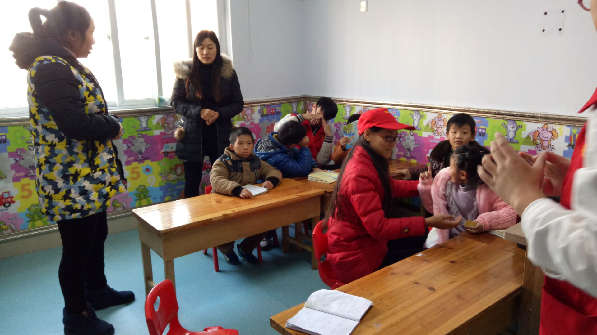 天气虽然寒冷,但也阳光明媚。缕缕暖阳照射在前行志愿者们的身上,他们加快脚步,希望为孩子们带去温暖。到达目的地后,干事许华婷向第一次去参加志愿服务活动的志愿者们介绍孩子的一些基本情况与活动的注意事项。志愿者们刚推开教室的门,就看到孩子们 可爱的笑脸和充满期待的眼睛,小朋友们一窝蜂的冲了上去,他们有的拉着志愿者的衣襟,撒娇似的叫着“哥哥姐姐”,有的扯着志愿者的双手,奶声奶气的汇报自己的学习情况。志愿者们被这群可爱的孩子包围着,被这突如其来的热情感动着。他们坐在教室中间,让孩子们围坐在周围,形成一个大大的圆圈,像一家人一样一起唱儿歌、学跳舞、诵古诗。他们手把手的教顽皮的小朋友们演算数学题,耐心的纠正并讲解正确的解题方法。