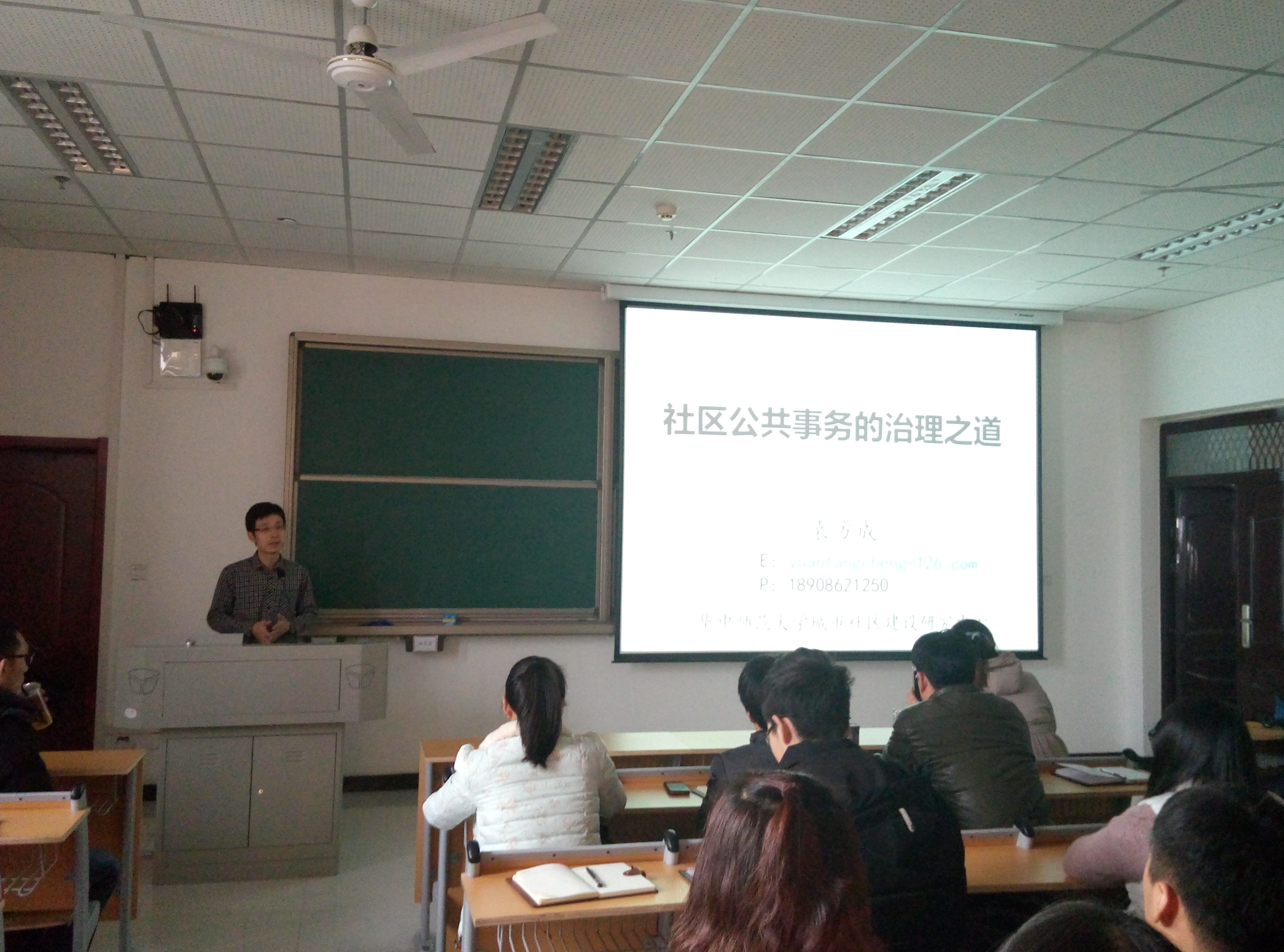下午2点半,讲座正式开始。关于《社区公共事务的治理之道》,袁方成教授以生活实际为出发点,对“我爱我楼”门栋自管组黄石市铁山区胜利路社区、“航运妈妈”宜昌市伍家岗区万寿桥街道航运区、“梅开二度”手拉手(失地农民再就业社团培育)枝江市马家店街道计划社区、“农夫”有田又有甜曹家林社区居委会等社区治理案例进行了深刻的讲解分析。对于社区出现的居民楼栋物业环境卫生管理滞后、留守儿童、失地农民再就业、土地滥用等问题,袁教授向大家列举了一些社区公共事务治理的传统思路与做法,并通过一些最新的典型案例分析指出了治理的新思路、新技术与新途径。袁教授指出,社区治理由传统到现代的转变,主要通过社区居民自治来实现。通过对社区公共事务治理的成功案例分析,袁教授总结出了社区公共事务的治理之道:针对社区需求;面向社区群体;运用专业技术;建立服务组织;创新服务机制;开发服务资源;创新社区服务。袁教授用风趣、轻松的话语去描述严肃的事情,也带给大家不一样的感受。
