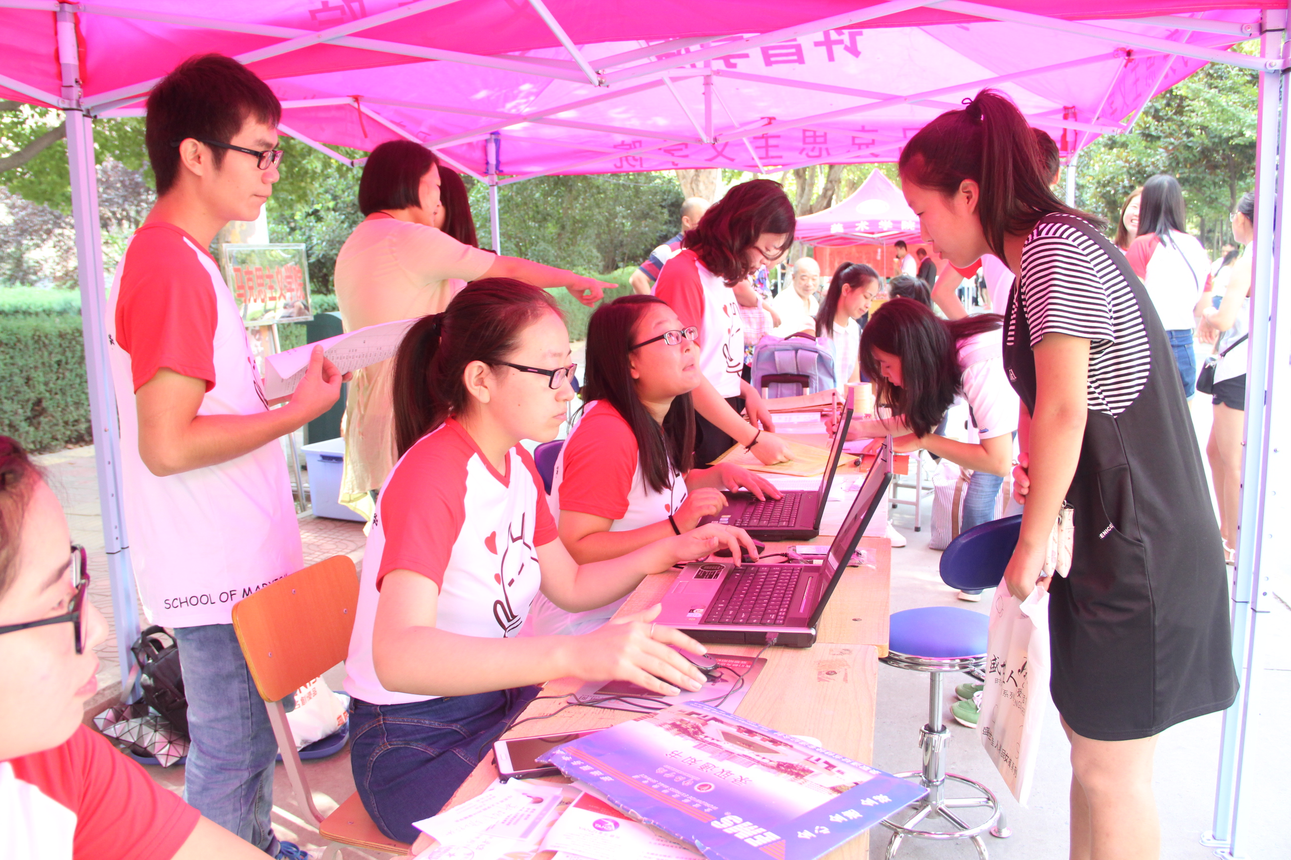 9月9日早上7点左右,工作人员就开始在迎新帐篷处忙碌起来,接待新生、搬运行李、咨询服务、电脑录入、收集档案、绿色通道……事无巨细,各方面都有专门人员负责。8时许,我院党总支书记许涛、院长寇鸿顺、党总支副书记周耀宏一行到迎新现场察看工作进展,慰问工作人员。校门口、报名处、宿舍门口等地都可以看到穿着印有“马克思主义学院”标志衣服的迎新人员,从学校大门口到报到处再到宿舍,他们尽自己最大的努力给予2016级新生热情的服务与帮助。虽然很忙、很累,但是看到新生们一张张可爱的笑脸,他们却觉得很开心、很幸福。