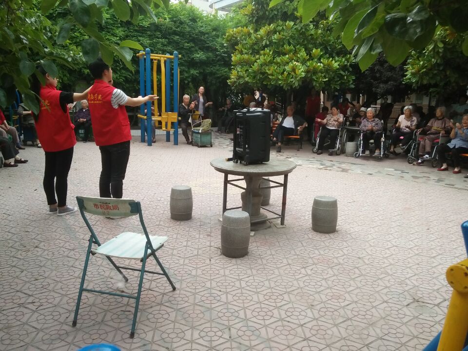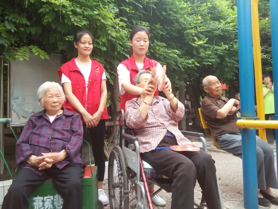 上午九点,志愿者们准时的在国旗台处集合。待负责人告诉志愿者在活动中的注意事项后,志愿者们便拿着院旗和道具兴奋的出发了。到达老年公寓后,志愿者们便开始了紧张有序的活动准备工作。有的志愿者一边打扫卫生,一边向老人嘘寒问暖,言语间,充满了爱的味道;有的志愿者清扫场地,布置音响等活动设备,炎热的天气下,细密的汗珠很快爬满了志愿者的额头。老人们看到忙碌的孩子们,总是亲切的让他们停下脚步,歇息片刻。很快,场地便布置完毕,下午三点半,老人们围坐在一起,其乐融融,幸福满满。一曲《虹之间》勾起了老人年轻时的美好回忆,感叹岁月静好;悠扬婉转的《桃花村》让人如痴如醉,老人们闭着眼睛,沉浸在国粹经典的世界中;小品《甄嬛后传》惹得老人们哈哈大笑,志愿者幽默的语言,滑稽的行为惹得老人拍手叫好;当听到熟悉而又有味道的家乡戏《刘大哥讲话》时,老人们情不自禁的随着节拍轻轻吟唱,有的甚至流下了感动的泪水;口琴表演《我的祖国》使得在场的红军爱好者蠢蠢欲动,他们纷纷随着节拍,高声大唱,这有力的歌声充满了对祖国无限深沉的爱……在表演的最后环节,志愿者为了锻炼老人的灵活能力,手把手的教他们手指操。老人们被这新奇的锻炼方式深深地吸引,都投入其中,认真学习。小小的庭院被如暖阳般的爱深深包围着,老人们接受着志愿者的颗颗爱心,沉浸在幸福,喜悦中。