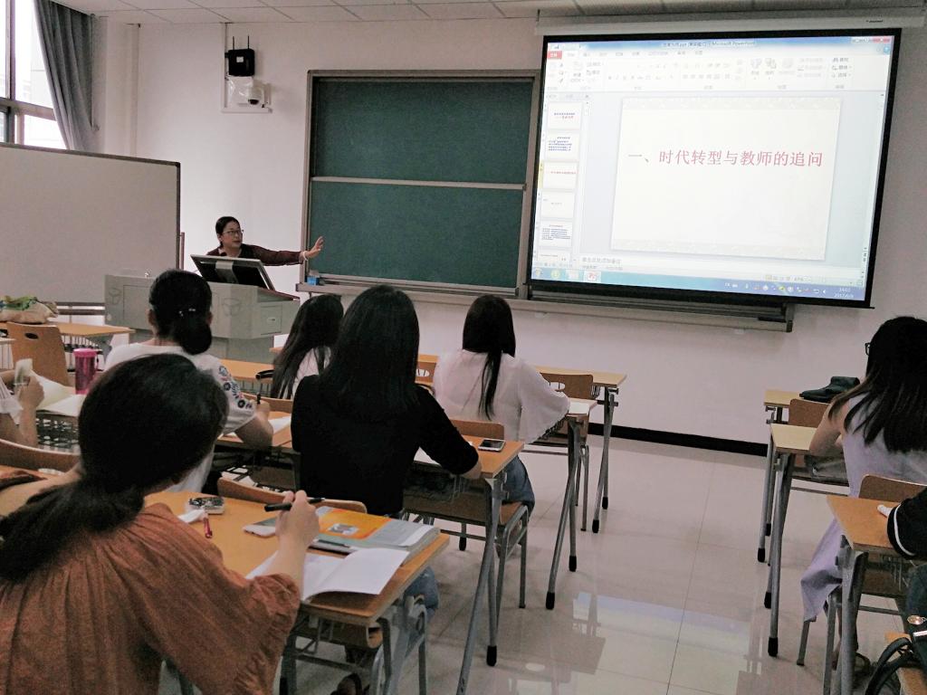 胡校长作为许昌学院思政专业的老校友,诚挚地跟学生们分享了她对于初中教师的所感所悟。首先,胡校长以视频的形式向学生展示现代社会信息技术飞速发展趋势,让我们不得不对教师这一职业进行追问:如何在信息化如此发达的时代成为一名好的教师。胡校长认为就是要成为一名觉者,实现觉者为师的教育境界。