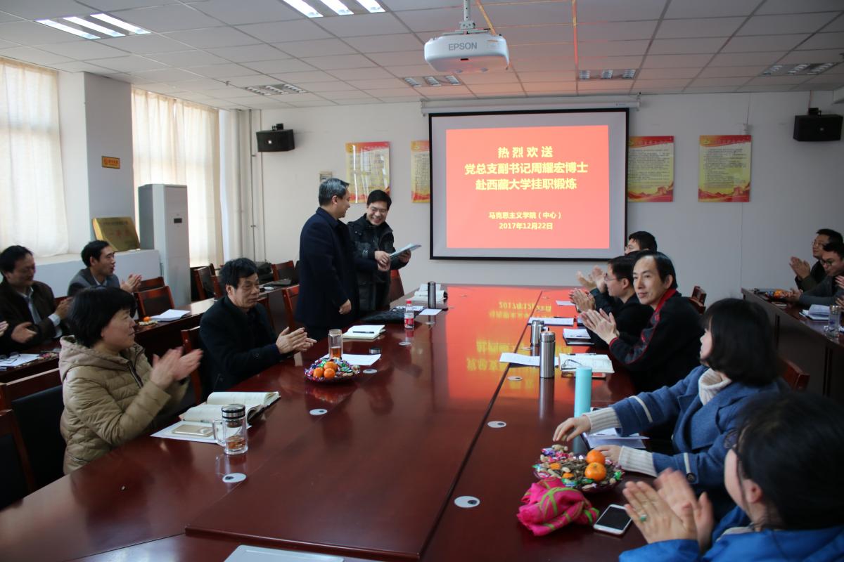 12月22日上午,我院(中心)全体教职工在E-1130会议室欢聚一堂,热烈欢送党总支副书记周耀宏博士赴西藏大学马克思主义学院挂职锻炼。党总支书记许涛同志主持欢送会。