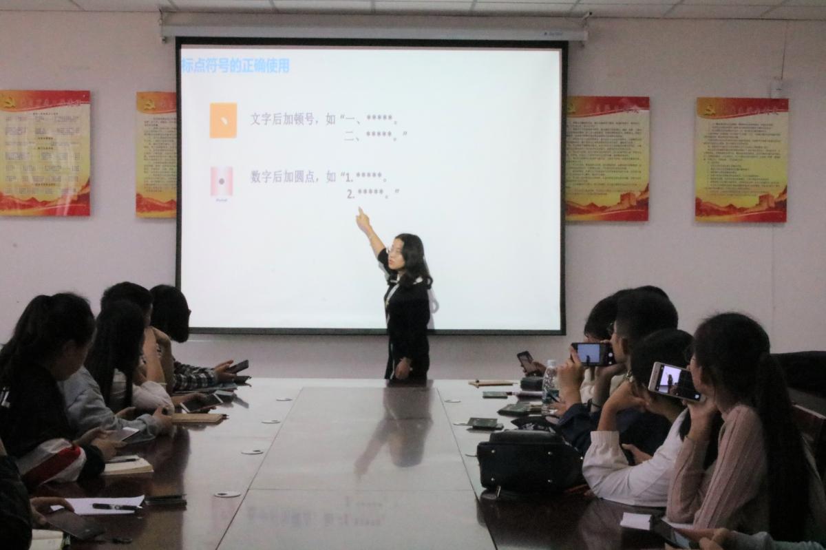 在培训会上,办公室副主任付晓婷以ppt的形式向新成员们讲解了文案撰写的格式和要求、文档发送的形式以及ppt制作的注意事项等几方面内容。条理清晰的讲解让新成员们在一定程度上掌握了文案撰写的基本要求。经过文案的培训后,宣传部部长吕坤讲解了关于新闻的撰写要求、照片拍摄的注意事项和后期处理以及视频剪辑方法等内容,此外,宣传部部长又以照片对比的形式着重讲解了如何选取照片拍摄的角度以及如何正确掌握拍照技术两个问题,使同学们更加了解了照片的拍摄和视频的制作。历时一个小时,培训会圆满结束。