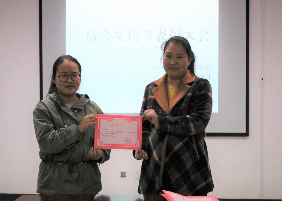 初赛是以宿舍检查的形式进行,评委们进入宿舍对宿舍各方面进行了全方位的评比,经过初赛之后,我院共评选出十个学生宿舍参加宿舍文化节的决赛。决赛以PPT的形式进行展示,每个讲解人都以轻松幽默的语言道出自己宿舍的独特之处,各宿舍PPT展现出来的不仅有活泼可爱的舍友,还有属于每个宿舍独一无二的装饰风格,每个宿舍独有的、富有生命力的寝室文化,体现了青年大学生勃勃的生机与活力。在各宿舍展示完自己的宿舍文化之后,由评委总结了各宿舍得分。根据得分,评选出最佳创意奖、最佳温馨奖、最佳设计奖三个奖项,由团总支书记张静为106、118、109三个获奖宿舍进行颁奖,活动圆满结束。