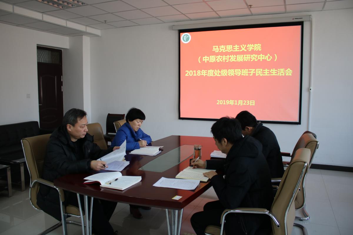 1月23日下午,马克思主义学院(中原农村发展研究中心)在E-1120会议室召开2018年度党员领导干部民主生活会。领导班子成员许涛、寇鸿顺、周耀宏、张凤云参加生活会。会议由党总支书记许涛主持。