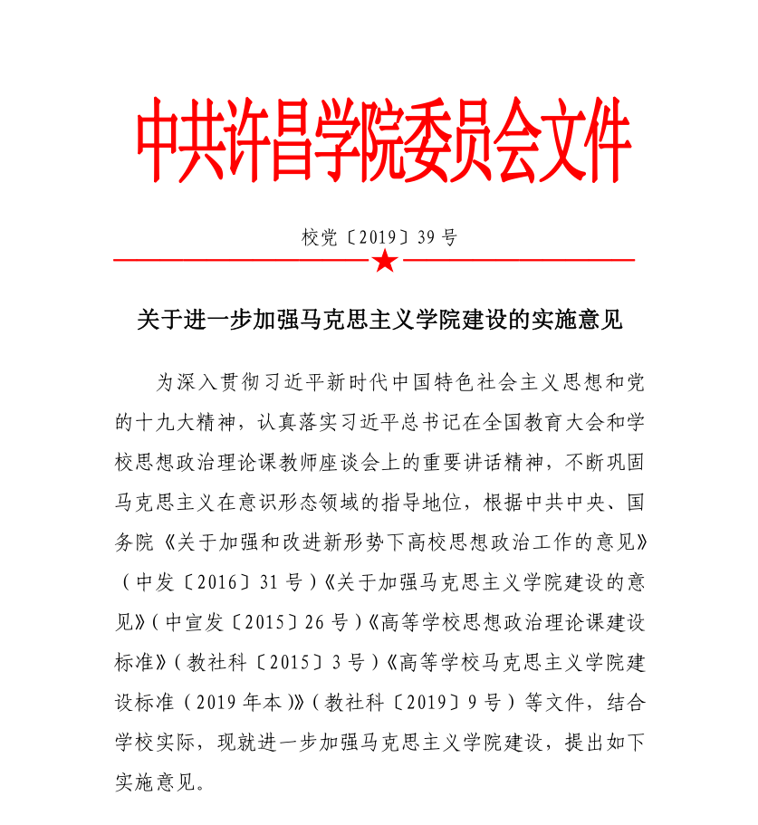 为深入贯彻习近平新时代中国特色社会主义思想和党的十九大精神,认真落实习近平总书记在全国教育大会和学校思想政治理论课教师座谈会上的重要讲话精神,不断巩固马克思主义在意识形态领域的指导地位,根据中共中央、国务院、中宣部、教育部等发布的系列相关文件精神,结合学校实际,近日,我校党委制定并印发了《关于进一步加强马克思主义学院建设的实施意见》文件。