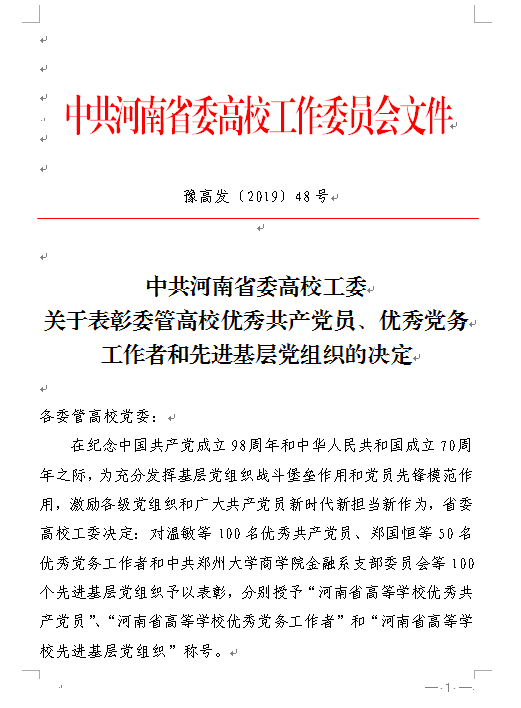 6月26日,根据中共河南省委高校工委《关于表彰委管高校优秀共产党员、优秀党务工作者和先进基层党组织的决定》(豫高发〔2019〕48号)文件,我院党总支书记许涛同志荣获“河南省高等学校优秀党务工作者”荣誉称号。此次全省仅有50名同志获此荣誉。这是自2018年6月我院党总支荣获“河南省高等学校先进基层党组织”之后,我院在党建工作方面获得的又一殊荣。