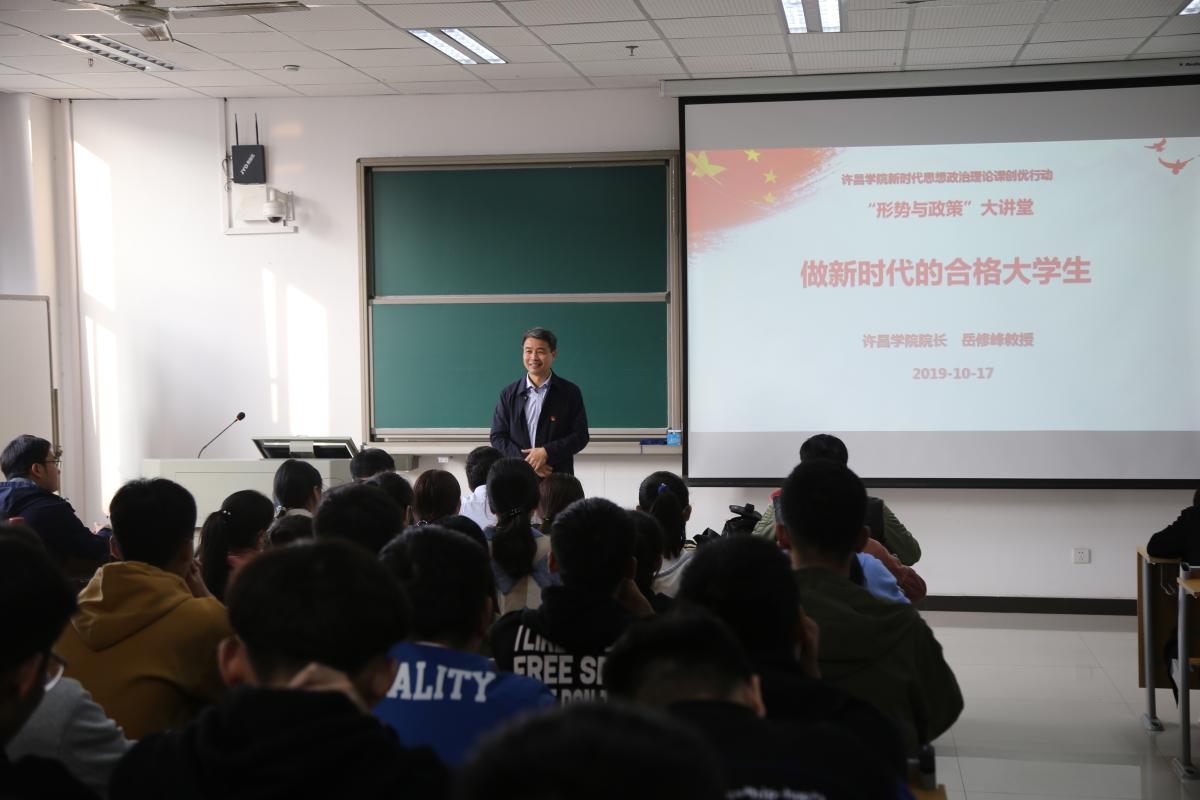 2019年10月17日上午,在我校E-506教室,马克思主义学院19201学期“形势与政策”大讲堂第一期专题讲座如期举行,讲座由许昌学院院长岳修峰教授主讲。岳修峰教授以《做新时代的合格大学生》为题,给学生们上了一堂精彩的思政课。