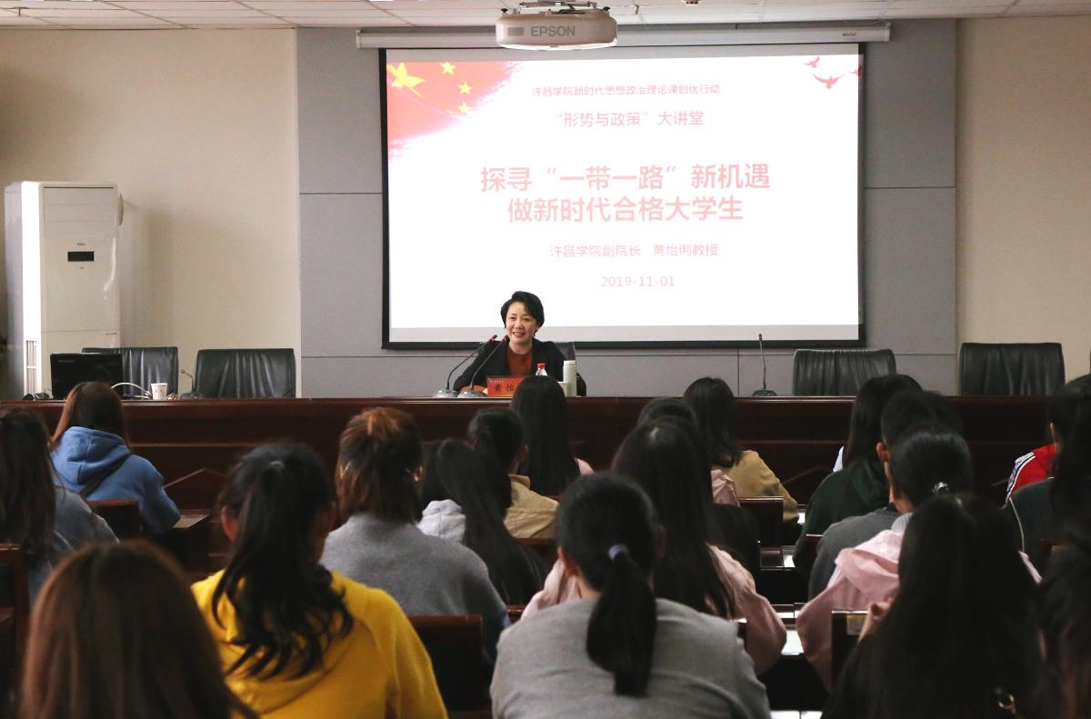 11月1日下午,许昌学院副院长黄怡俐教授做客马克思主义学院第三期“形势与政策”大讲堂,开展专题宣讲。她以《探寻一带一路新机遇 做新时代合格大学生》为题,为联点院系外国语学院2018级学生代表上了一堂形势政策与学业专业密切结合的精彩理论课。
