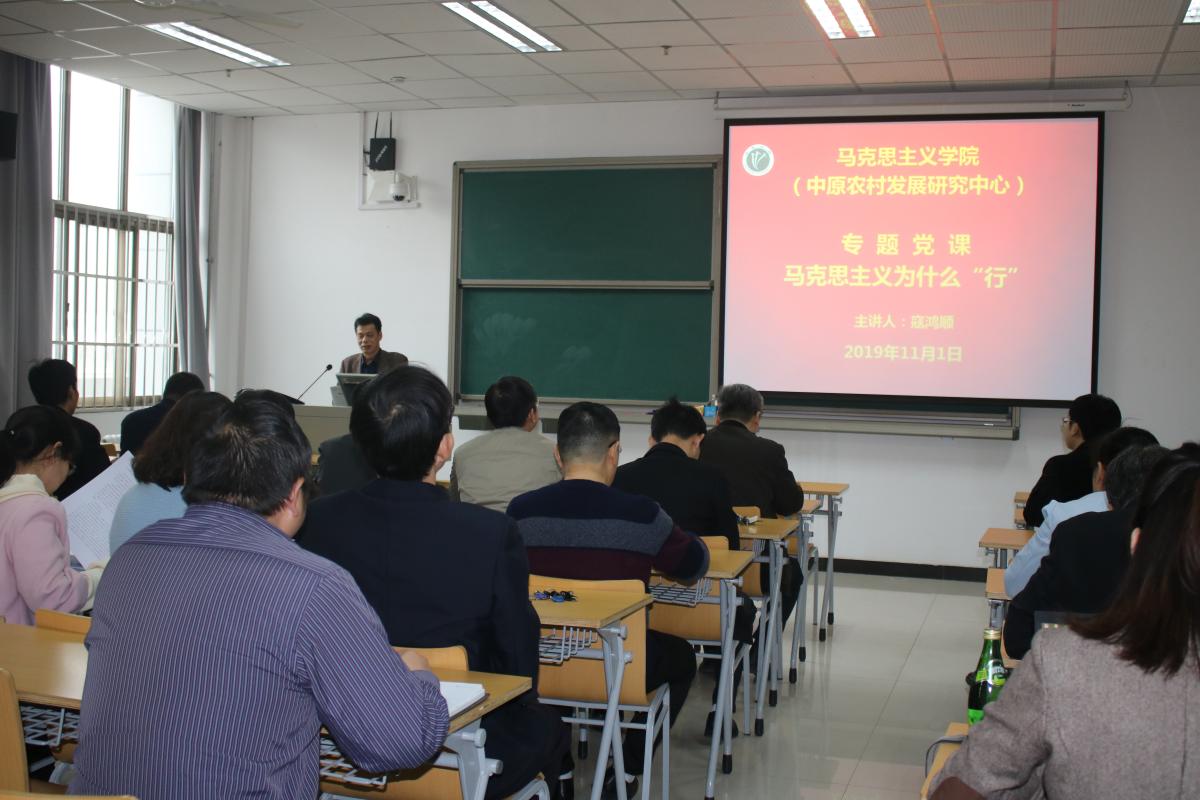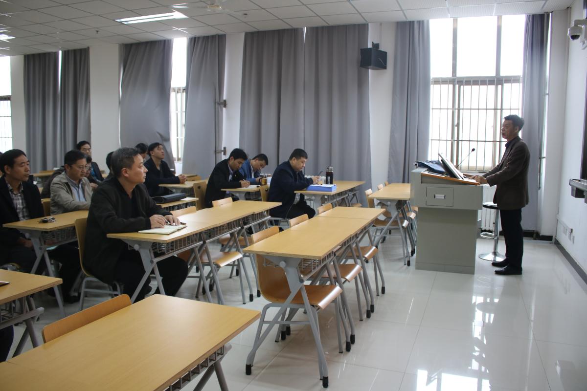 2019年11月1日下午,马克思主义学院举行“不忘初心、牢记使命”主题教育专题党课、暨习近平新时代中国特色社会主义思想研修班第三次讲座。全体教职工参加学习。院长寇鸿顺主持讲座。