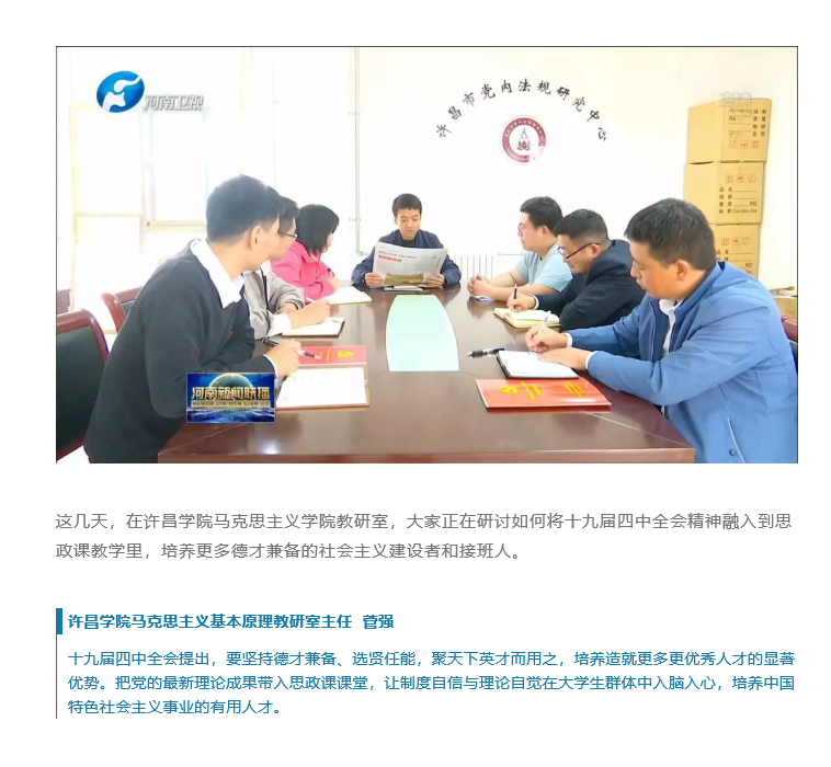 采访中,我院马克思主义原理教研室围绕如何将十九届四中全会精神融入到思政课教学里,培养更多德才兼备的社会主义建设者和接班人展开热烈讨论。教研室主任菅强表示,十九届四中全会提出,要坚持德才兼备、选贤任能,聚天下英才而用之,培养造就更多更优秀人才的显著优势。把党的最新理论成果带入思政课课堂,让制度自信与理论自觉在大学生群体中入脑入心,培养中国特色社会主义事业的有用人才。