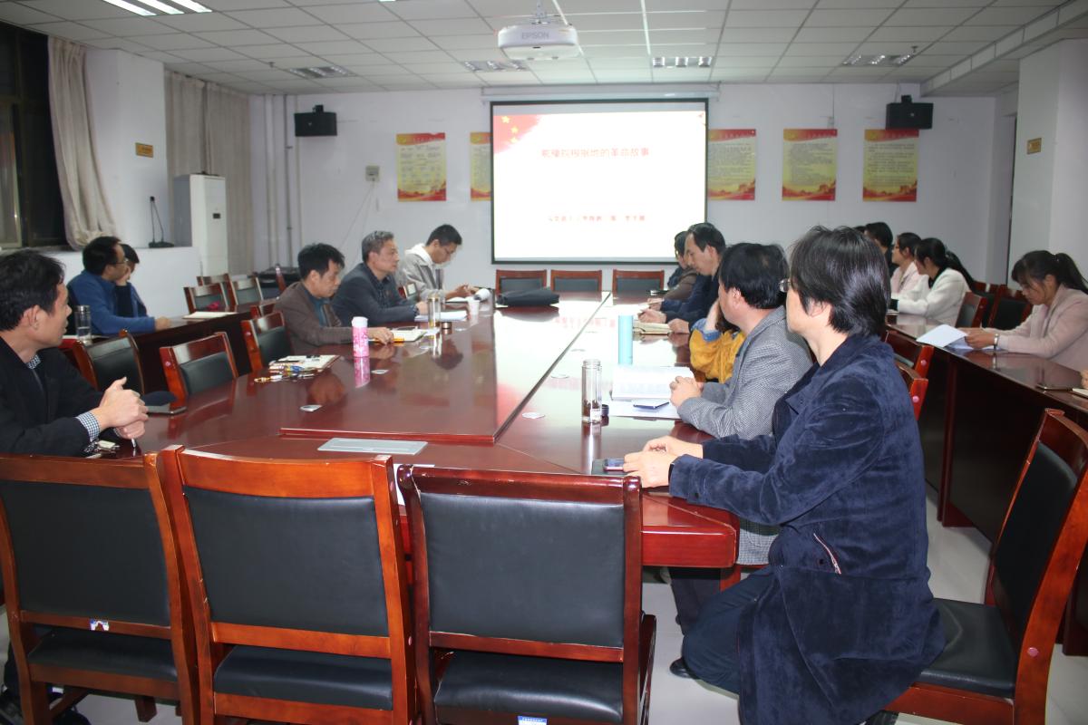 习近平总书记考察调研河南时强调,要讲好党的故事、革命的故事、根据地的故事、英雄和烈士的故事,把红色基因传承好,确保红色江山永不变色。为进一步贯彻学习总书记重要讲话精神,结合我院主题教育工作具体安排,11月8日下午,教工第一支部书记刘镭同志在文科综合楼E1130会议室为全体党员围绕鄂豫皖根据地的讲述革命故事。