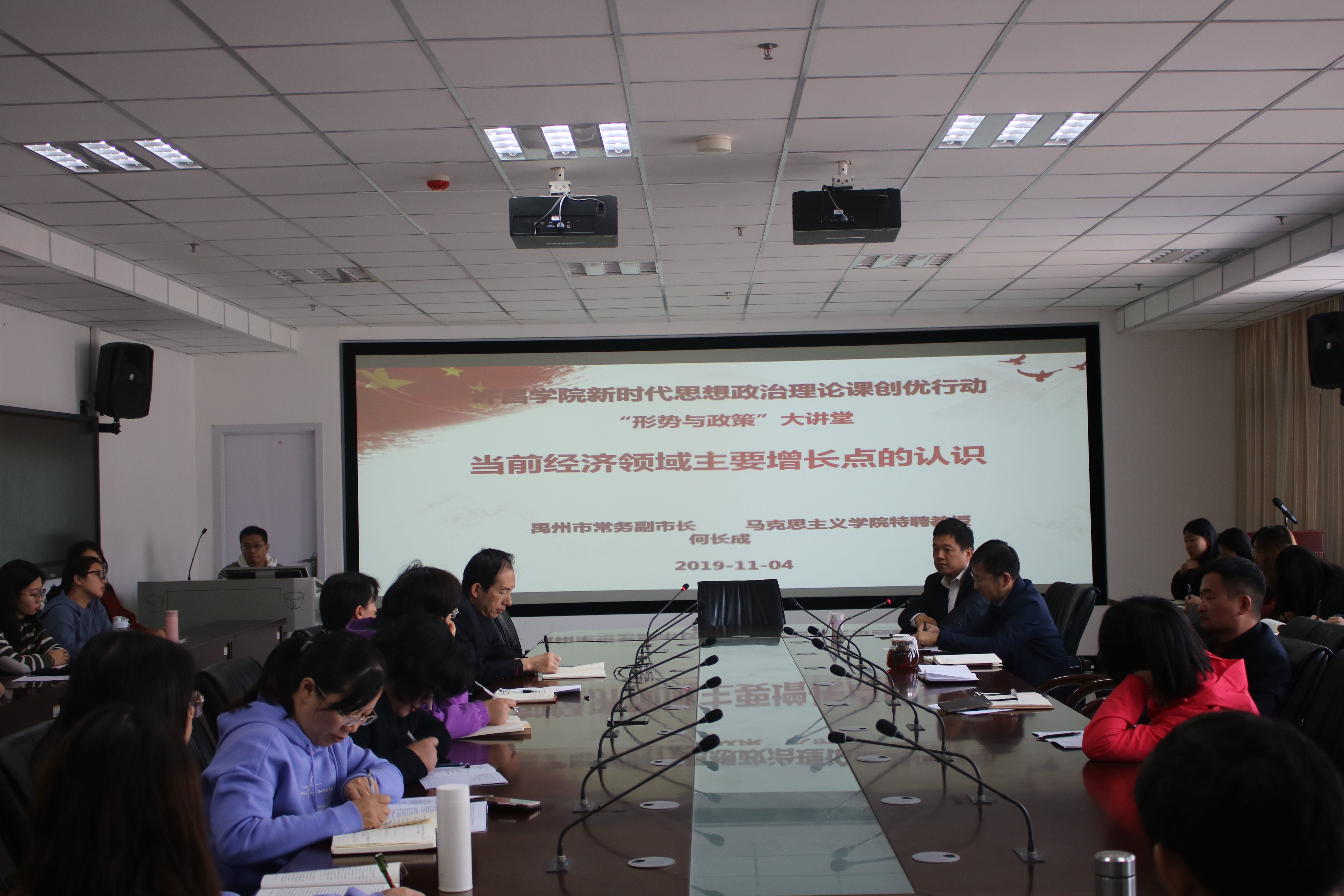 11月4日下午,马克思主义学院特聘教授、中共市委常委、禹州市常务副市长何长成在文科综合楼727智库平台举行了“地方经济与社会治理”专题系列学术讲座第一讲,何市长的讲座主题为《当前经济领域主要增长点的认识---以河南县域经济为例》,马克思主义学院全体师生及其他学院教师代表80余人参加了本次学术活动。