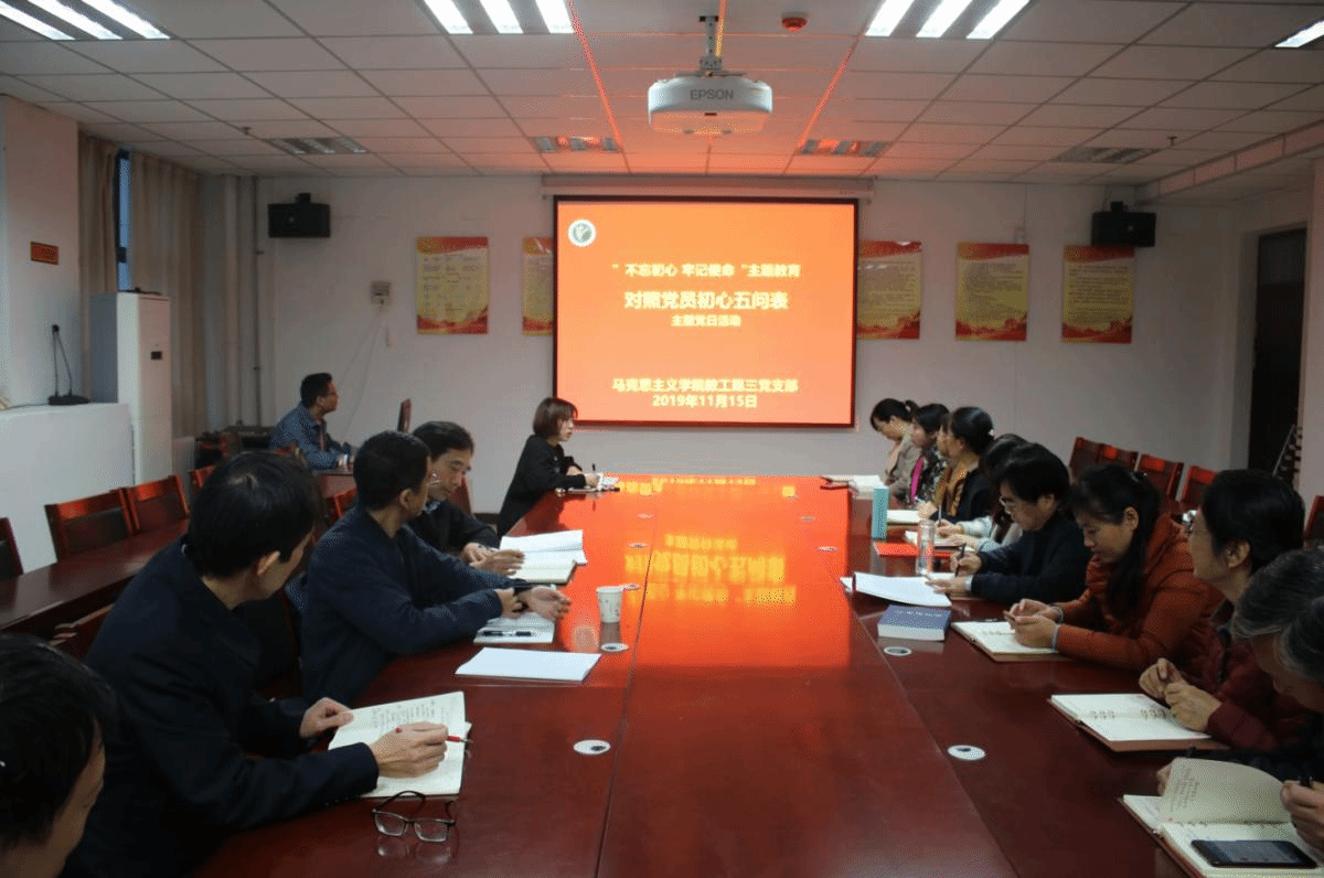 为确保“不忘初心、牢记使命”主题教育工作落到实处,强化党员意识和党性修养,11月15日下午,马克思主义学院教师第三党支部在党员活动室开展“五问忆初心”主题党日活动。活动由党支部书记菅强主持。