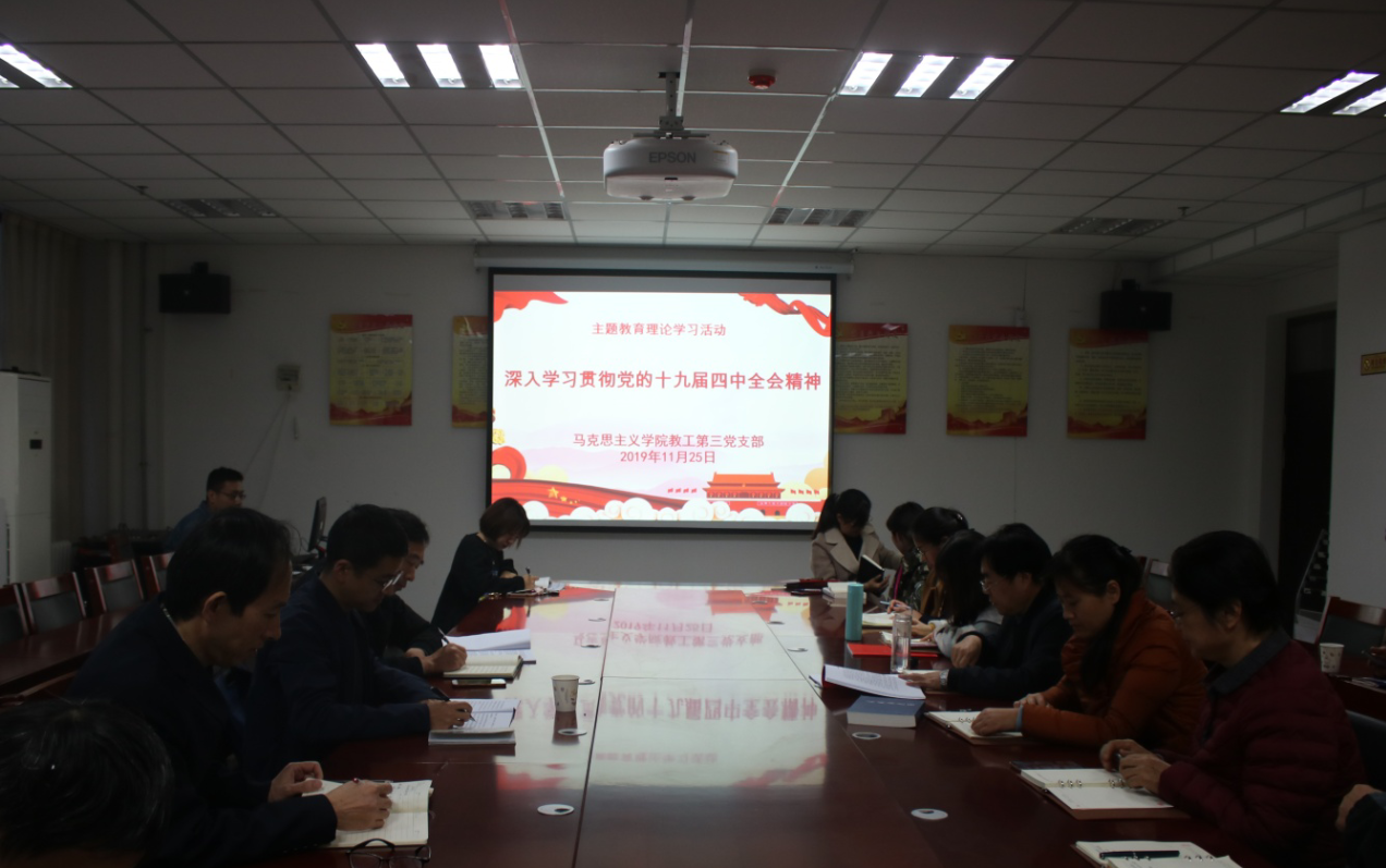 11月25日,马克思主义学院教师第三党支部在E-1130开展学习党的十九届四中全会精神活动,全体党员参加学习会。