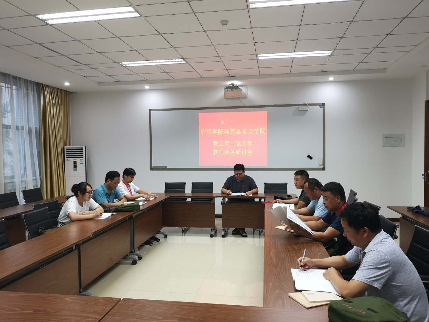 7月29日晚,马克思主义学院教工第二党支部利用到大别山干部学院进修的机会,组织支部全体党员在大别山干部学院212教室进行专题业务研讨会,专题组织学习研讨两办印发的《关于深化新时代学校思想政治理论课改革创新的若干意见》和高水平马院建设标准。