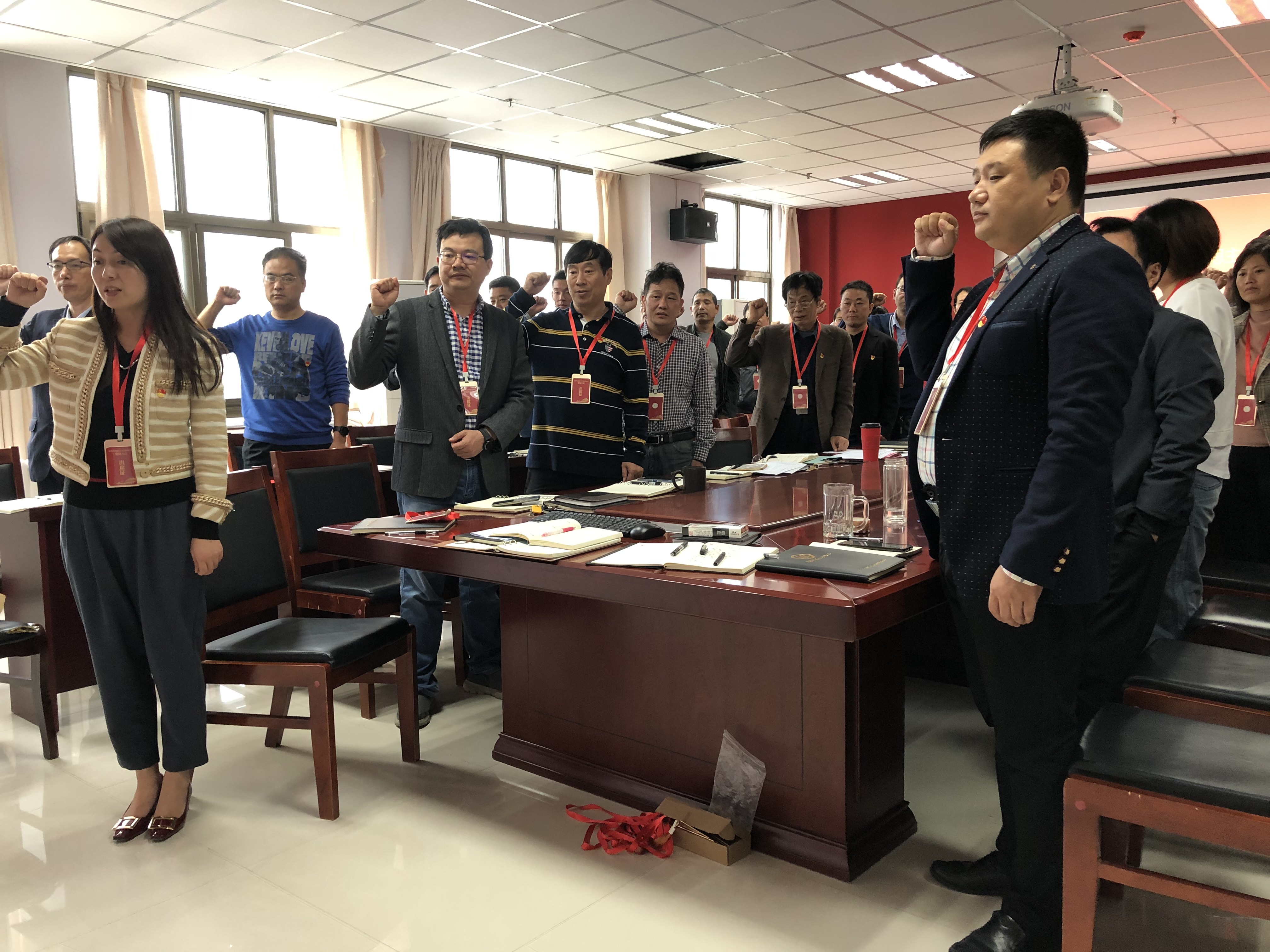 党员大会最后,马克思主义学院全体党员在谢依楠同志的带领下,面向党旗,重温入党誓词,不忘入党初心,牢记思政课教师的职责、使命与担当,本次换届选举大会在热烈的掌声中圆满结束。