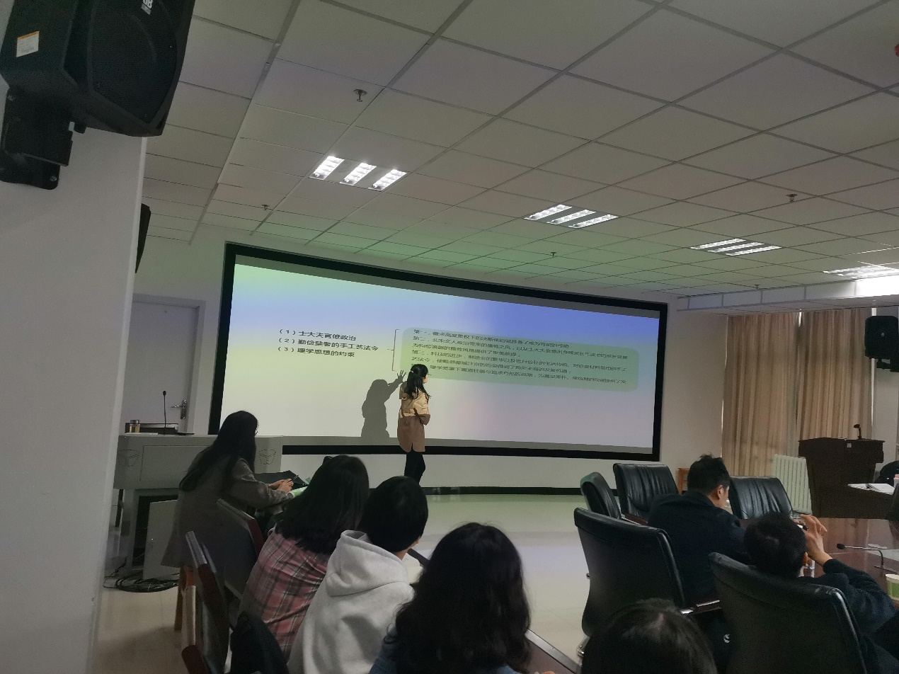 李维维老师从三个方面为大家介绍了钧窑制器的审美变迁过程。一是制器的祭祀意义。这种祭祀意味,和巫术模仿和宗教礼仪相似,都是灵论世界观的体现,同时,也是一种进行生产的组织方式,人们在仪式的模仿操练过程中,将取得一种感性普遍化的表现形式。二是器型以“中”为原点的设计。中国人尚“礼”,无论宫殿的建造,还是庭院的布置,寻找“中”正的轴线尤为重要,在传统礼乐文化里充当符号化语言的礼器,也体现了“中”的思想。中,不偏不倚,无过不及。三是釉质的“尚玉”观。“尚玉”的观念在不同的历史时期有不同的表现,它会随着儒家文化的变化而变化。李老师通过PPT的展示,为大家带来了一场有关钧窑制器的视觉盛宴。除此之外,李老师也指出钧窑作为我们国家的非物质文化遗产,需要在发展中继承,在继承中发展,与时俱进,顺应时代发展潮流。在点评与交流环节,谢老师和王老师进行了精彩的点评,并提出相关问题进行讨论。与会的学生也积极表达自己的观点并提出问题,李维维老师耐心细致地解疑释惑。