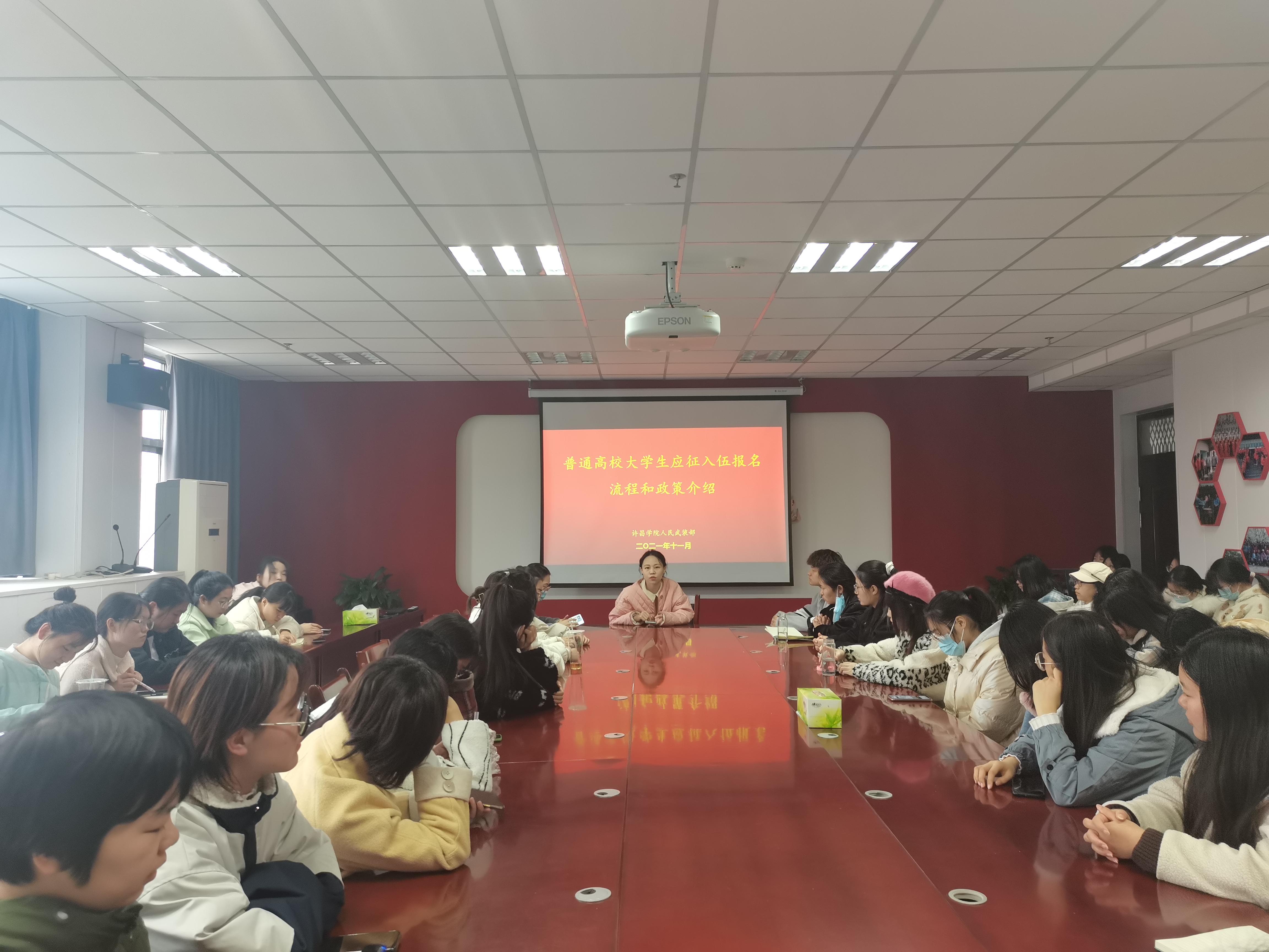征集在校大学生入伍,是新形势下提高部队兵员素质、加强国防和军队现代化建设的重大举措。为响应国家号召、进一步做好征兵宣传工作,马克思主义学院组织全体学生于12月8日上午9:00在文综楼1130进行了“应征入伍动员暨政策解读”宣传活动。