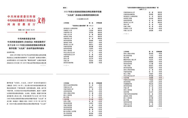 近日,中共河南省委宣传部、中共河南省委教育工委办公室、河南省教育厅下发了《2022年度全省学校思想政治理论课教学技能“大练兵、大比武、大展示、大提升”活动评选结果的通知》(豫教工委〔2022〕84号),我校参赛教师3名获得一等奖,2名获得二等奖。