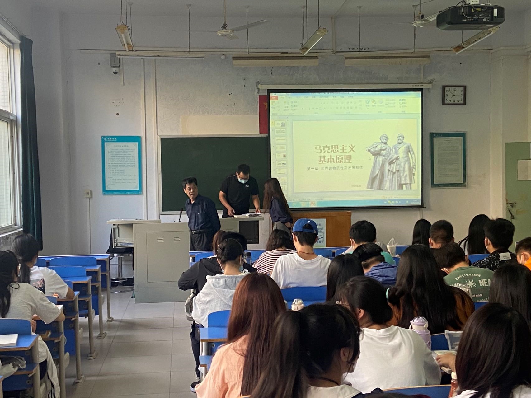 2022年9月26日,我校迎来了新学期线下教学开学第一课。马克思主义学院为确保教学秩序的正常运行,规范教学管理,谢依楠书记、寇鸿顺院长带领主管学生工作的副书记、主管教学的副院长、教学管理人员深入各教学楼巡视教学工作,了解各班级线下教学第一课上课情况、教师授课安排、学生的上课状态和课堂到课率等情况。