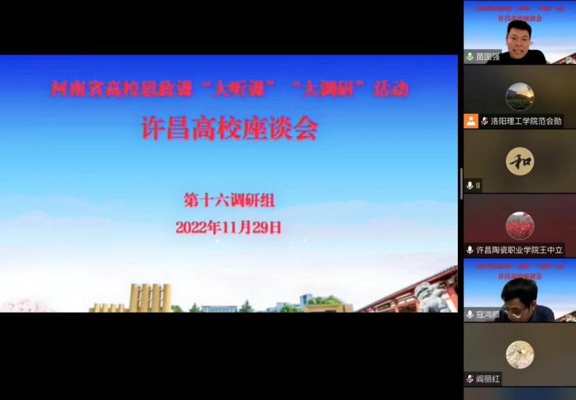 为深入贯彻习近平总书记历次关于思政课建设的重要讲话精神,落实《中共河南省委教育工委办公室河南省教育厅办公室关于开展2022年度全省高校思政课秋季学期“大听课”“大调研”活动的通知》,第十六调研组于2022年11月29日与许昌各高校在云端相聚,成功召开了许昌高校座谈会。许昌学院马克思主义学院寇鸿顺院长,思政课教师代表李文君、陈会娟参加此次座谈。