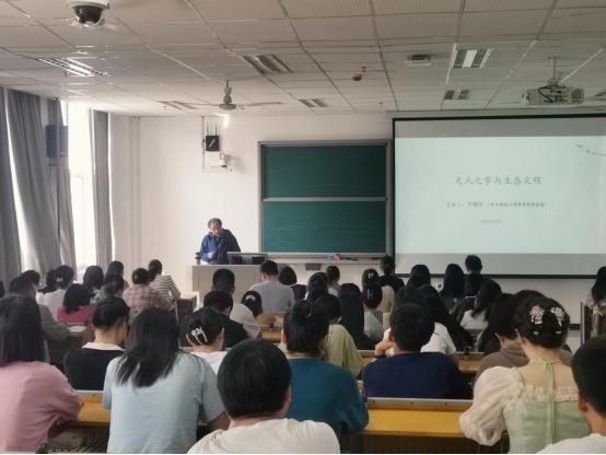 论坛上,李教授从人与天地自然的关系、人与万物的关系、顺应自然与当代启示等四个部分为我们进行全面且系统的讲解。在第一部分,李教授强调先是天地之于人的关系,其次才是人之于天地的关系;在第二部分,他指出人与万物平等且一体共在,要学会“利用厚生”与“以时禁发”。另外,天人之学更重视天地万物与人的精神联系,这种联系表现为道德与审美两个方面。物的自然性本身就是某种德性的显现。在第三部分,他指出顺应自然是天人之学处理人与自然关系的根本原则。它体现在庄子的所讲的顺物之自然性而为,且不可突破自然性所容许的限度。在第四部分指出节制物欲才是天人之学所启示的解决生态危机的根本出路。李教授报告逻辑清晰、言简意赅、诙谐幽默,给在场的师生带来了不一样的思想启迪。