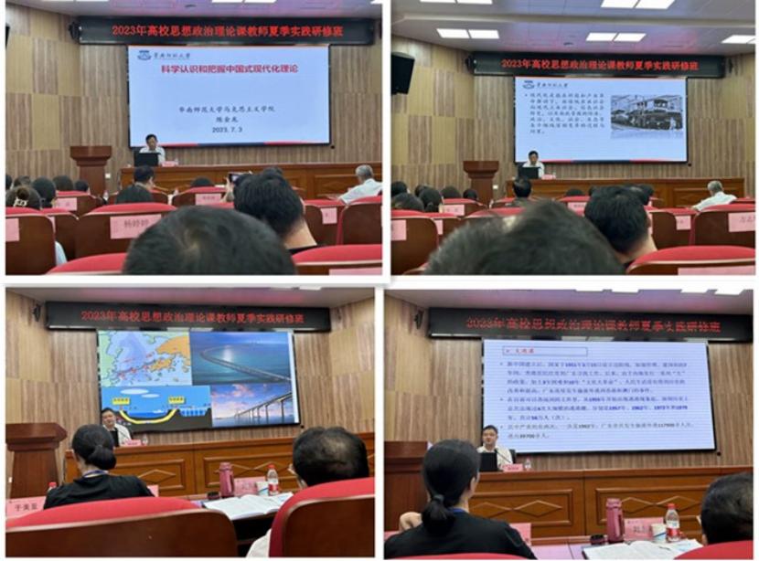 本次研修班通过专题报告、现场教学、自主安排等方式开展研修学习活动。学员们在华南师范大学全国高校思想政治理论课教师研修基地的组织下参与专题讲座学习,陈金龙教授以深厚的理论功底,从“为何要建构中国式现代化理论、中国式现代化理论的基本内容、中国式现代化与中华民族伟大复兴的关系”等六个方面为学员们讲授《科学认识和把握中国式现代化理论》、胡国胜教授以一种诙谐幽默、轻松愉快的风格从广东改革开放的发展历程、广东改革开放的成功经验、习近平总书记对广东的期望和要求等方面展开讲授《改革开放精神》。