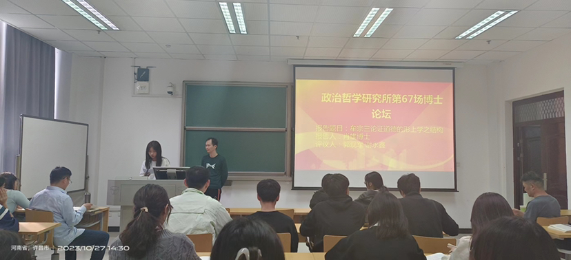 2023年10月27日下午两点半到四点二十,我院第67场博士论坛在文科综合楼206举行。本次论坛的主题是《牟宗三论证道德的形上学之结构》,主讲嘉宾是湖北大学肖雄副教授,点评嘉宾是谢永鑫老师和郭现军老师,我校师生90多人参与本次论坛。