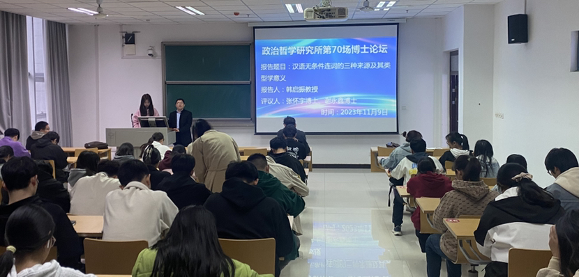 2023年11月9日下午4点30至5点50,政治哲学研究所第70场博士论坛在文科综合楼204举行。本次论坛的主题是“汉语无条件连词的三种来源及其类型学意义”主讲人是许昌学院文史与传媒学院副院长韩启振博士,点评人是谢永鑫博士和张怀宇博士,我校师生一百余人参加本次论坛。
