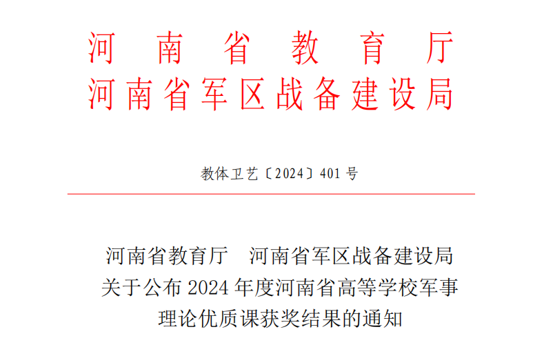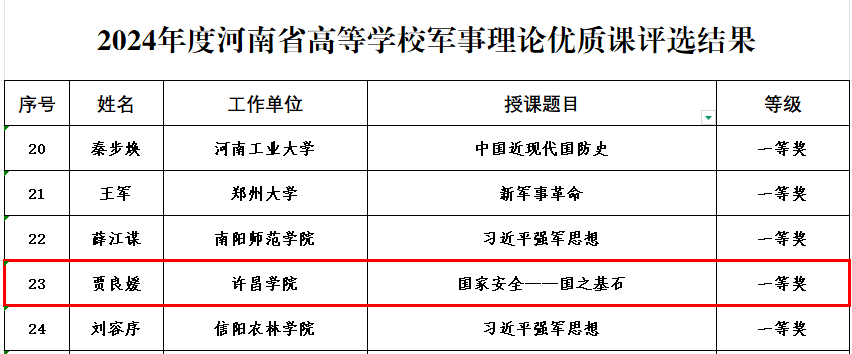 近日,河南省教育厅、河南省军区战备建设局下发了《关于公布2024 年度河南省高等学校军事理论优质课获奖结果的通知》(教体卫艺〔2024〕401 号),许昌学院马克思主义学院教师贾良媛在此次比赛中获得一等奖的佳绩。