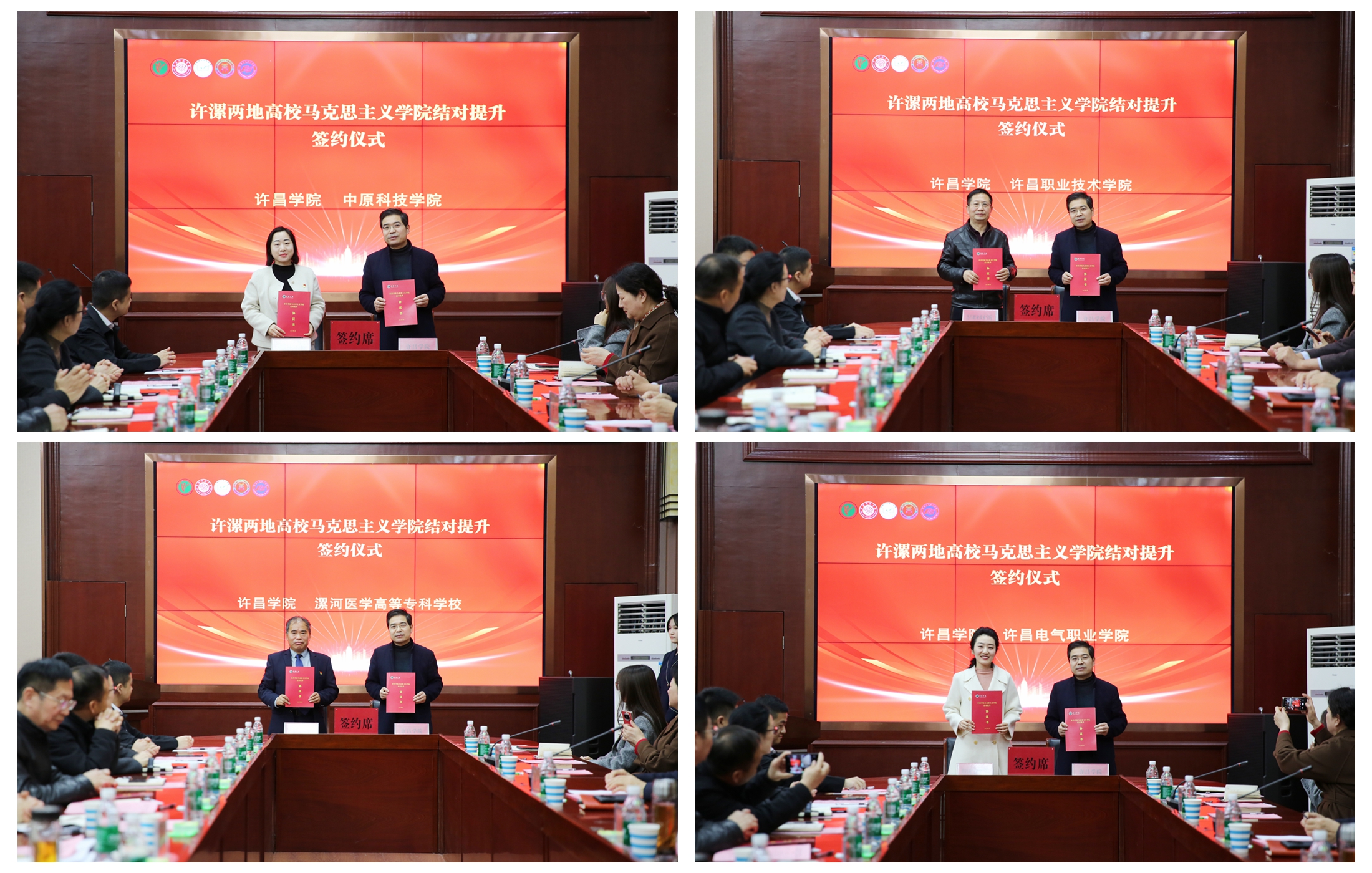 签约仪式上,许昌学院与中原科技学院等四所高校签署结对提升协议书。许昌学院马克思主义学院院长周耀宏、漯河医学高等专科学校马克思主义学院院长贺斌分别作表态发言,他们一致表示将积极落实各项合作任务,加强校际沟通与合作,协力推动马克思主义学院迈向新台阶。