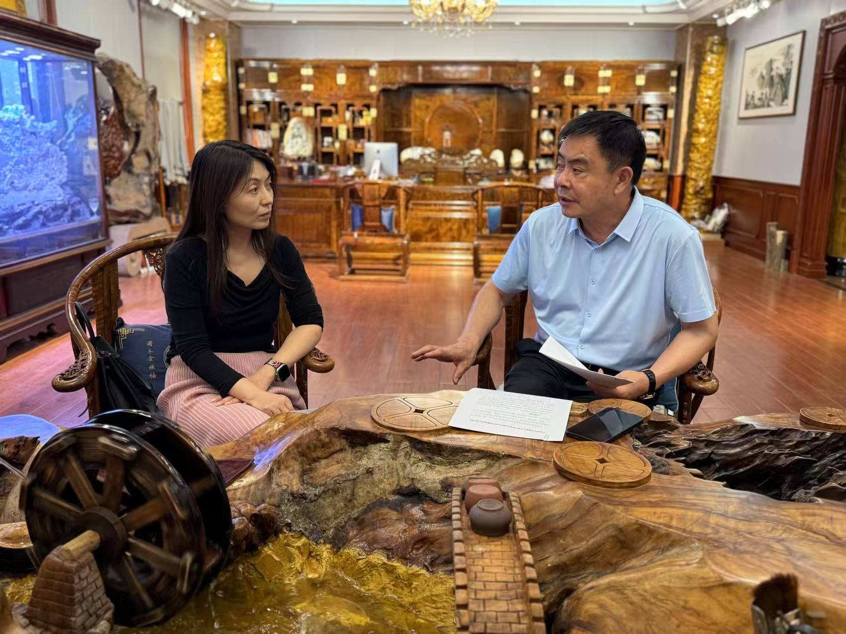 许昌裕丰金丝楠博物馆是一家非公有公益展馆,我院党委书记谢依楠作为马院(基地)联合党委书记,结合学院和中原农耕文化博物馆实际,详细了解了许昌裕丰金丝楠博物馆的展馆陈列、文化特色、发展前景和用人需求,与馆长宋松继围绕思想政治教育与中国传统文化艺术的结合路径、学院人才培养方向如何与企业实现精准化对接、场馆育人在实践育人、课程育人、文化育人过程中如何发挥价值最大化等问题进行了深入探讨。