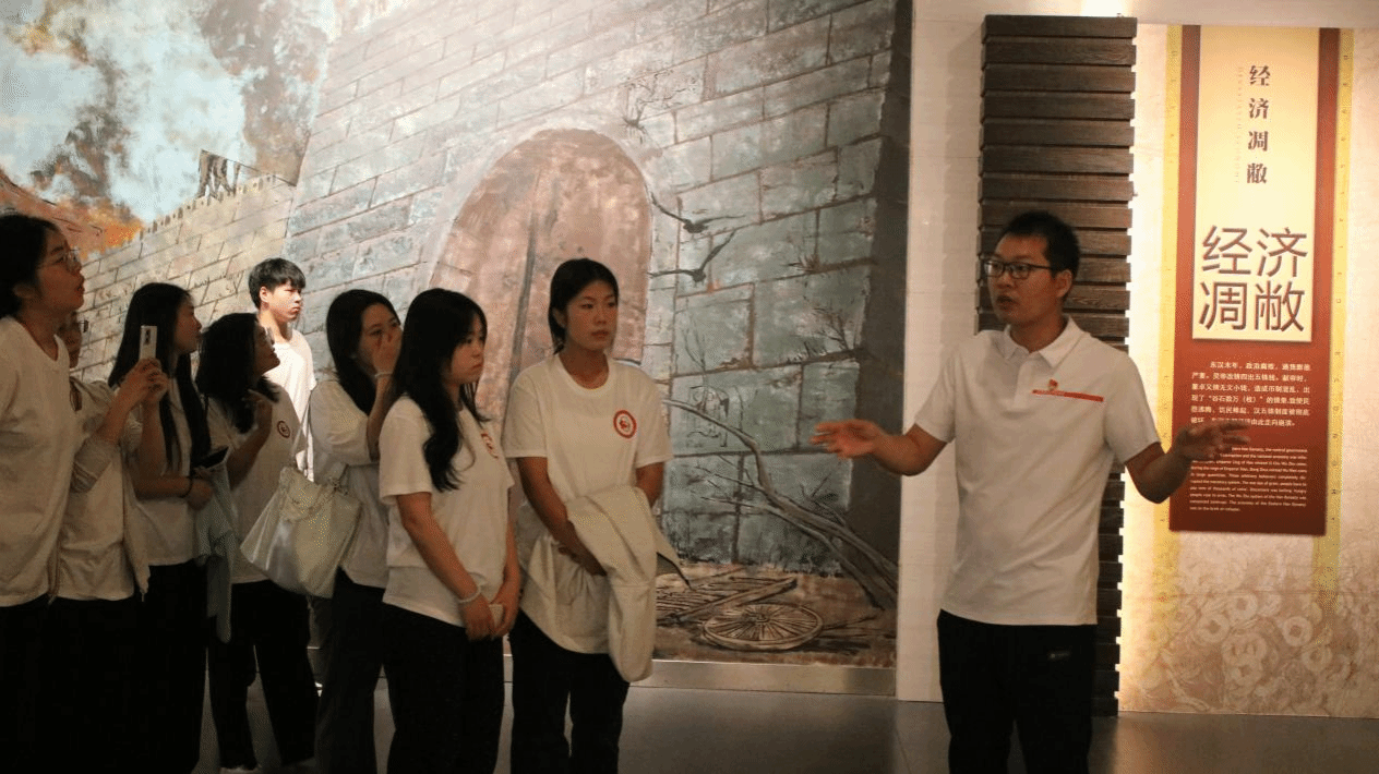 签约仪式结束后,马克思主义学院思政课教师李大旗以许昌市博物馆丰富的历史资源为依托,展开了一堂别开生面的 “行走中的思政课” 。他将历史文物与理论知识巧妙结合,利用许昌博物馆展厅中关于“许下屯田”和“曹魏军制”的展出,为在场师生深入讲解 “农村包围城市,武装夺取政权” 这一革命新道路的开辟历程,引导莘莘学子在研学实践中感悟革命先辈的智慧与勇气,汲取奋进力量。