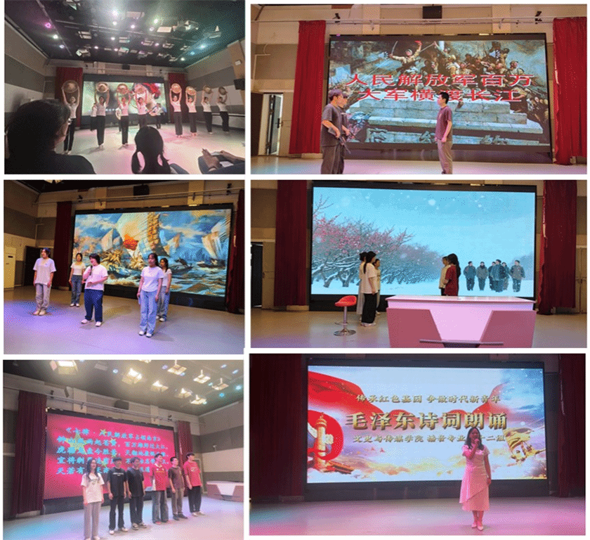 比赛现场气氛热烈,来自各院系的25组参赛队伍依次登台。外国语学院带来的《破晓之光(1936年〈沁园春·雪〉)》,以激情澎湃的演绎,展现革命诗词的磅礴气势;音乐学院的同学们用歌曲唱响《长征》《重上井冈山(1965)》等经典,以激昂的歌声传递红色精神;国际教育学院的《半边天(1939 年〈四言诗·妇女解放〉)》则通过芭蕾舞剧,展现独特的艺术魅力;文史与传媒学院的《沁园春长沙》《人民解放军占领南京》《菩萨蛮·黄鹤楼》《秋收起义》更是亮点频出,通过诗词连诵和舞台剧的形式,带大家重温革命峥嵘岁月。