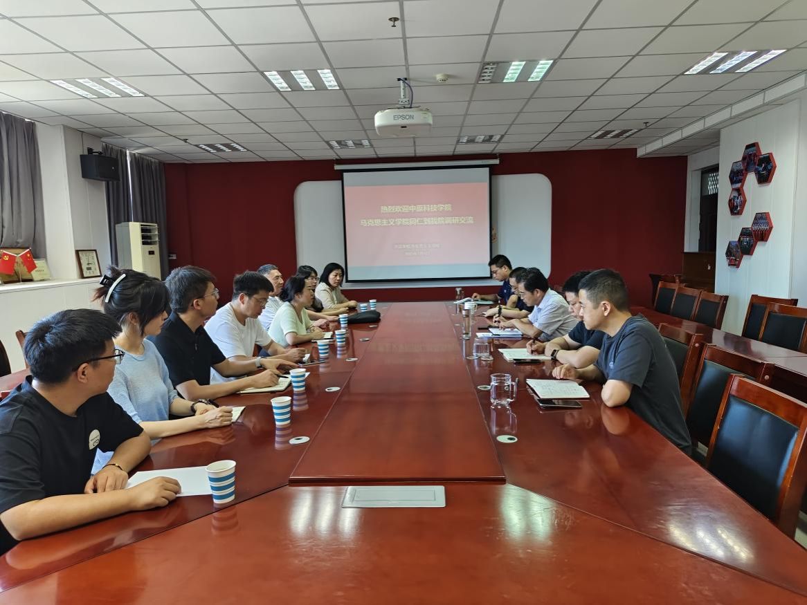 7月4日,中原科技学院马克思主义学院院长朱媛一行到我院开展调研交流。座谈会在文综楼1130会议室举行,院长周耀宏、党委副书记岳凯声、副院长林云飞、菅强,大中小学思政课一体化建设教研室主任刘镭出席会议。座谈会由院长周耀宏主持。