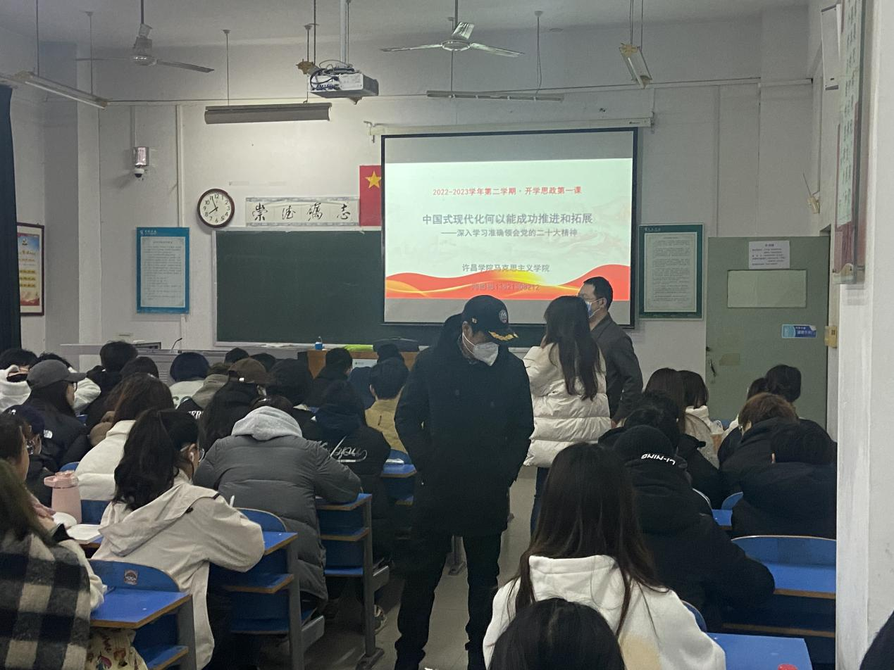 2023年2月13日,我校迎来了新学期线下教学开学第一课。马克思主义学院为确保教学秩序的正常运行,规范教学管理,谢依楠书记、寇鸿顺院长、郭现军主任带领主管学生工作的副书记、主管教学的副院长、教学管理人员深入各教学楼巡视教学工作,了解各班级线下教学第一课上课情况、教师授课安排、学生的上课状态和课堂到课率、教学设施是否完好等情况。
