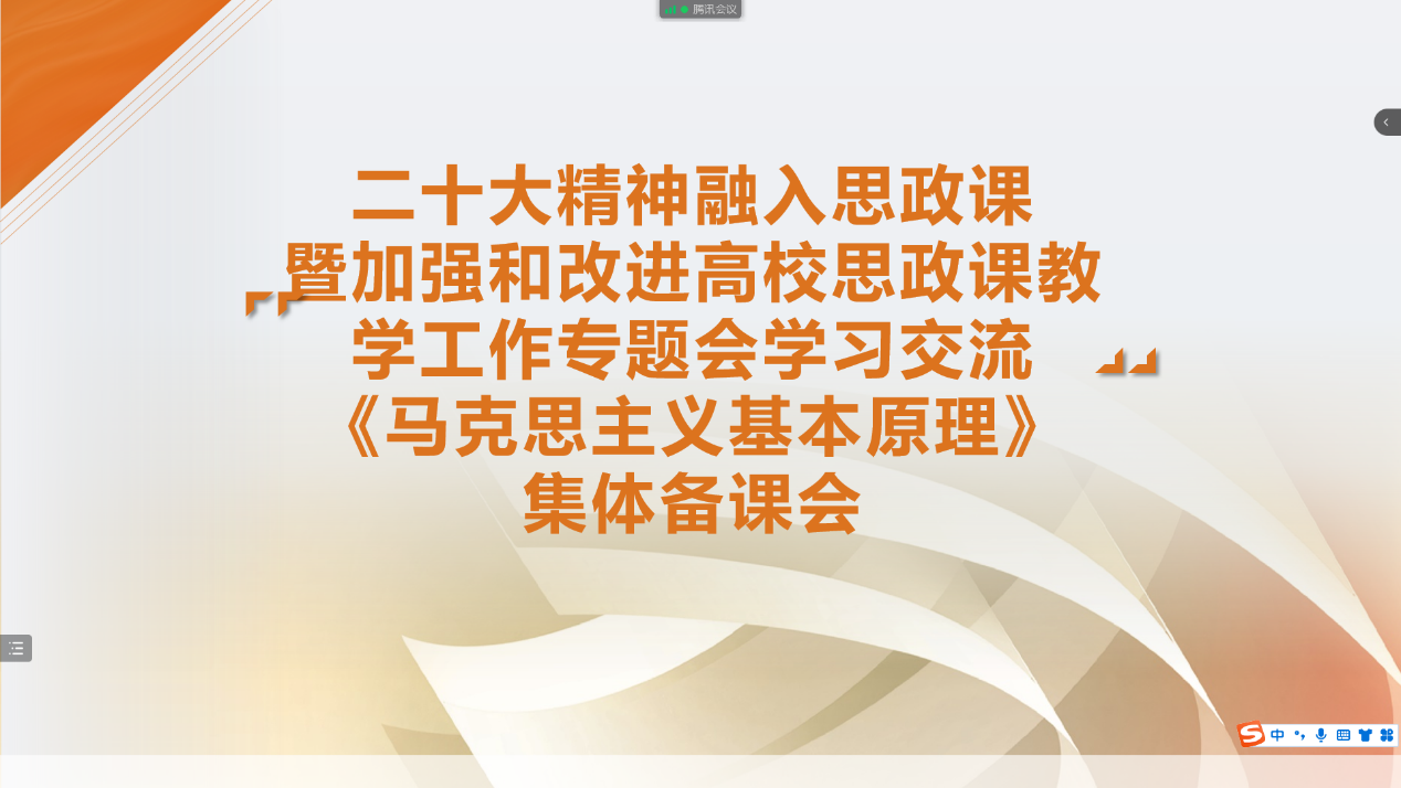 为及时把党的二十大精神融入思政课教学之中,在参加省教育厅组织的《马克思主义基本原理教学要点及参考资料》教学工作专题会培训之后,2022年11月11日下午4:00,《马克思主义基本原理》教研室围绕落实《关于上好高校思政课的指导意见》和《教学要点及参考资料》培训,以党的二十大融入思政课为主题展开集体备课线上活动。《马克思主义基本原理》专兼职教师全部参加了本次活动。会议由原理教研室主任徐冠军主持。
