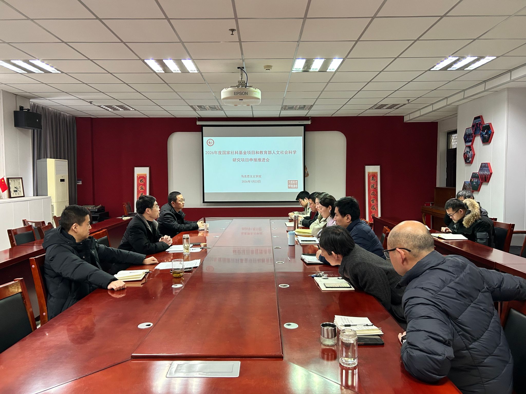 为深入推进有组织科研,切实提升2026年度国家社科基金及教育部人文社会科学研究项目申报质量与立项率,1月23日下午,马克思主义学院在文科综合楼1130会议室召开项目申报推进会。院长周耀宏、副院长菅强及全院博士教师参加会议,会议由副院长菅强主持。