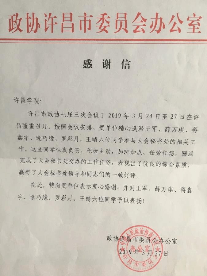 2019年3月21-27日,我院精心派选王军、薛万琪、蒋鑫宇、逄巧缘、罗彩月、王晴六位同学,参与到许昌市政协七届三次会议的准备工作中,展现了许院学子优良的品性与能力。