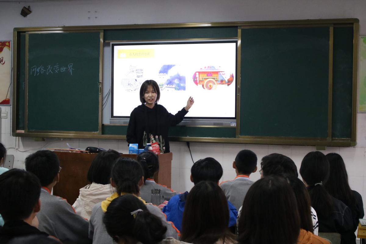 本次教学活动主要内容是,由付晓婷、秦真两位同学在八年级授课,其他同学观摩两位同学的授课过程,并提出自己的意见和建议。秦真同学的课题是八年级上册的《网络改变世界》,付晓婷同学的课题是七年级上册的《感受生命的意义》。秦真同学从网民数量调查的视频开始,针对互联网的作用、功能,互联网的好处,以及如何对待互联网等方面进行了讲解。在上课过程中,她不仅通过播放视频、引用名言、讲解例子等方式激发学生兴趣,还以讨论、提问、鼓励等形式调动学生的积极性,充分发挥了自身所具备的教学技能,体现了良好的教学素养和课堂掌控能力。付晓婷同学以“生命列车”作为课堂主线,完美地将授课内容融化于“生命列车”的行程中,逐步引导学生感受生命的意义,思考生命的价值,最后进一步引导学生列出自己的梦想清单,在升华学生的情感体验中结束授课。两位同学的授课表现,充分体现了她们对教材、学情和教学设计的理解,显现了良好的专业素养和教学技能。在两位同学的讲解过程中,其余同学也在的本子上对本次讲课活动做了记录,思考本次教学观摩活动的有益之处。