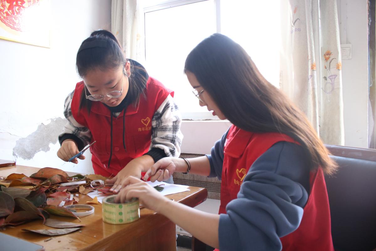 到达基地后,志愿者们首先与基地负责人进行了沟通。随后,为了让老人们的娱乐活动场所更加干净整洁,志愿者们对其进行了打扫,他们拖地扫地、擦拭窗户、涮洗抹布,在每一个环节都保持认真的态度。在打扫卫生时,志愿者们注意到了桌子上摆放的树叶。在询问基地负责人后,他们得知这些树叶是被收集来做活动场所的手工装饰品。听罢,他们便自告奋勇地接下了这个任务。在他们的努力下,银杏树叶变成了一只只蝴蝶,柿子树树叶变成了一朵朵绽放的花朵……基地负责人看到他们的作品后,忍不住惊叹赞美,为志愿者们竖起了大拇指,志愿者们的自豪感油然而生。除此之外,志愿者们还陪着老人们聊天谈家常,推着老人出来晒太阳,此次志愿服务活动就在这样温馨的氛围下进入了尾声。