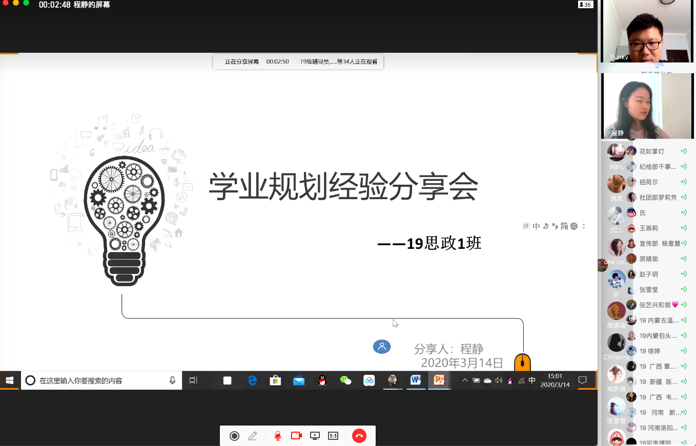 3月14日下午三点,按照学校相关要求,辅导员冯璐彤老师邀请了我院过去两届学业规划大赛的参赛学生程静和苏杭学姐通过在线会议的形式对大家进行了《学业规划书》撰写的指导工作,两位学姐结合自己的参赛经验,对撰写过程中每个部分所需要注意的事项进行了详细说明,提醒大家正视《学业规划书》的撰写对自己学习规划的重要意义,对大家完成《学业规划书》提供了更有实际意义的指导和参考。