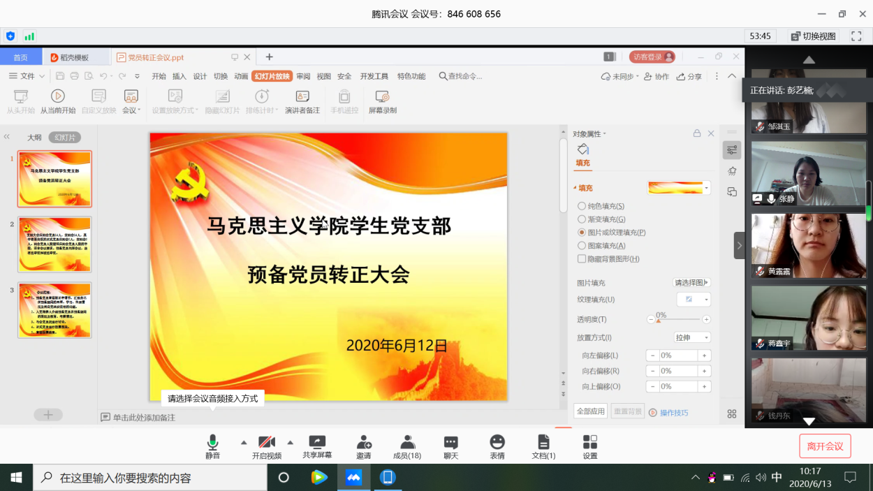 2020年6月12日,马克思主义学院学生党支部预备党员转正大会采用腾讯会议形式召开。本次会议由党支部书记张静老师主持,支部全体学生党员参加。