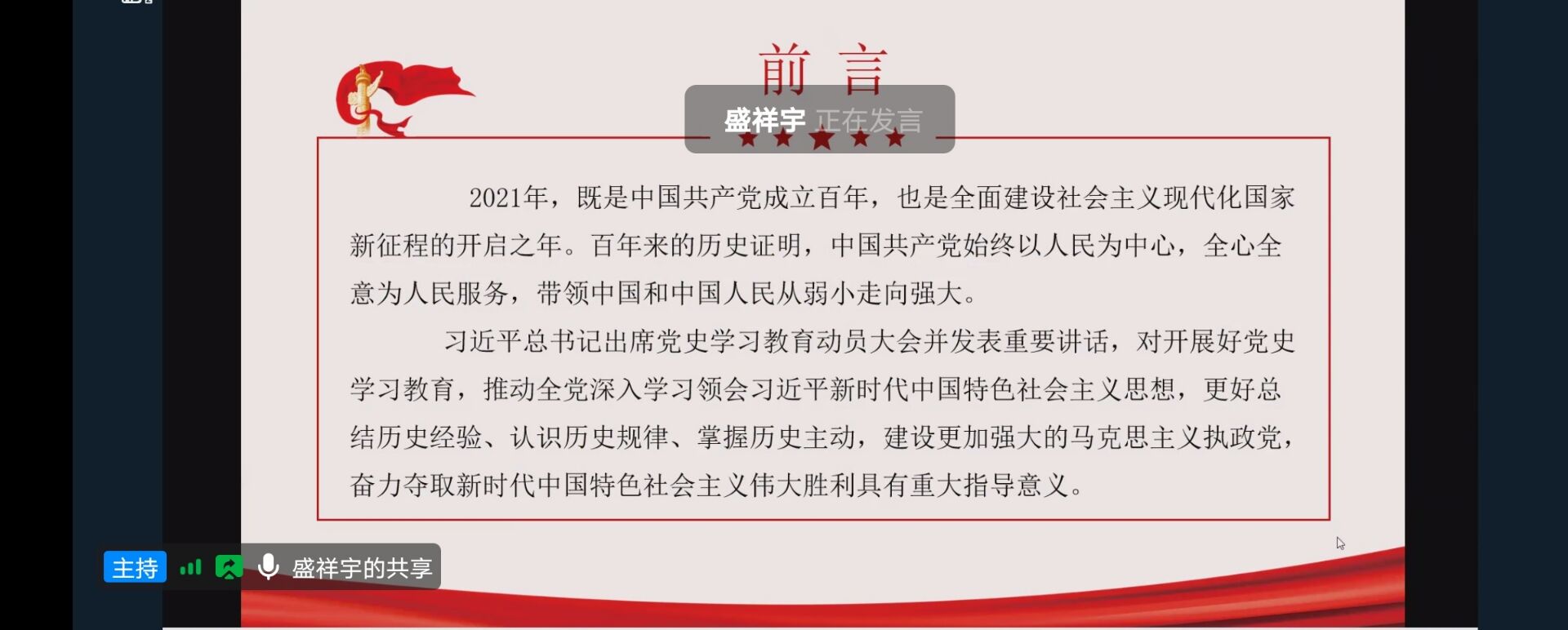 活动伊始,我院团委书记张静对这次活动发表讲话:“2021年正值建党100周年,全国范围开展了党史学习,每个学生都要学史明智、学史增信、学史崇德、学史力行,学党史、悟思想、办实事、开新局。”在活动中,医学院团支书盛祥宇从回顾中国共产党百年辉煌、中国共产党百年历史总结、中国共产党百年伟大贡献、开展党史学习的重大意义四个方面进行精彩的讲解。盛祥宇同学精彩的讲解不仅将活动氛围推至高潮,还让两院同学感悟到中国共产党的思想伟力。活动最后,医学院团支书盛祥宇向两院同学发起号召:“希望每位同学都能学习中国共产党百年历史,坚定中国共产党历史自信,坚定中国人民和中华民族未来自信,不忘初心,砥砺前行。”历时一个小时,本次活动在两院同学的积极参与下圆满结束。
