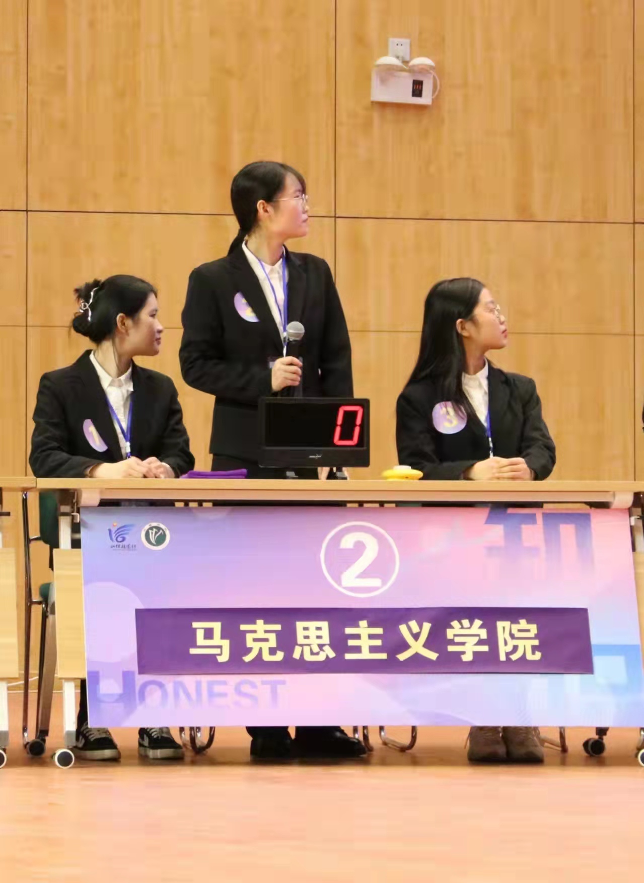 大赛围绕国家资助政策小常识、诚信贷还款、金融风险小知识等方面进行作答,我院由张萍,董贤芝,唐椿云,谭盛洁四位同学作为代表参加大学生“诚信校园行”学生资助知识大赛复赛。18支参赛队伍随机抽签分为三组进行比赛,各组前两名按照积分从高到低排名,前五支队伍进入决赛,每场比赛6支队伍参赛,我院于第三场上场比赛,我院参赛队员在个人必答题、抢答题、集体必答题都表现突出,其中风险必答题环节我院选手勇敢抓住机会,答对30分值的高风险题目,现场比拼气氛紧张浓烈。尽管最后没有成功晋级,但我院在赛场上展示了马克思主义学院的非凡风采,增强了应变能力与团队合作能力。